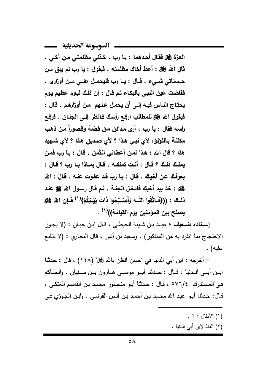 العزة عز وجل فقال أحدهما: يا رب، خذلي مظلمتي من أخي. قال الله عز وجل: أعط أخاك مظلمته. فيقول: يا رب لم يبق من حسناتي شيء. قال: يا رب فليحمل عني من أوزارى. ففاضت عين النبي بالبكاء ثم قال: إن ذلك ليوم عظيم يوم يحتاج الناس فيه إلى أن يُحمل عنهم من أوزارهم. قال: فيقول الله عز وجل للمطالب أرفع رأسك فانظر إلى الجنان. فرفع رأسه فقال: يا رب، أرى مدائن من فضة وقصورًا من ذهب مكللة باللؤلؤ، لأي نبي هذا؟ لأي صديق هذا؟ لأي شهيد هذا؟ قال الله: هذا لمن أعطاني الثمن. قال: يا رب فمن يملك ذلك؟ قال: أنت تملكه. قال بماذا يا رب؟ قال: بعفوك عن أخيك. قال: يا رب قد عفوت عنه. قال: الله عز وجل: خذ بيد أخيك فادخل الجنة. ثم قال رسول الله - صلى الله عليه وسلم - عند ذلك: {فَاتَّقُوا اللَّهَ وَأَصْلِحُوا ذَاتَ بَيْنِكُمْ} (¬١) فإن الله عز وجل يصلح بين المؤمنين يوم القيامة" (¬٢).