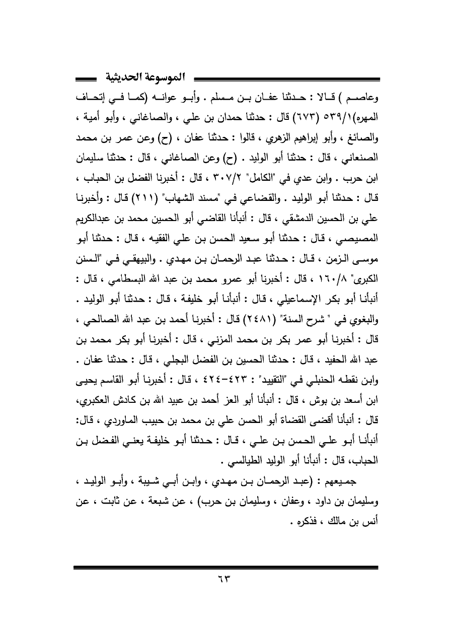 وعاصم) قالا: حدثنا عفان بن مسلم. وأبو عوانه (كما في إتحاف المهرة) ١/ ٥٣٩ (٦٧٣) قال: حدثنا حمدان بن علي، والصاغاني، وأبو أمية، والصائغ، وأبو إبراهيم الزهري، قالوا: حدثنا عفان، (ح) وعن عمر بن محمد الصنعاني، قال: حدثنا أبو الوليد. (ح) وعن الصاغاني، قال: حدثنا سليمان بن حرب. وابن عدي في "الكامل" ٢/ ٣٠٧، قال: أخبرنا الفضل بن الحباب، قال: حدثنا أبو الوليد. والقضاعي في "مسند الشهاب" (٢١١) قال: وأخبرنا علي بن الحسين الدمشقي، قال: أنبأنا القاضي أبو الحسين محمد بن عبد الكريم المصيصي، قال: حدثنا أبو سعيد الحسن بن علي الفقيه، قال: حدثنا أبو موسى الزمن، قال: حدثنا عبد الرحمان بن مهدي. والبيهقي في "السنن الكبرى" ٨/ ١٦٠، قال: أخبرنا أبو عمرو محمد بن عبد الله البسطامي، قال: أنبأنا أبو بكر الإسماعيلي، قال: أنبأنا أبو خليفة، قال: حدثنا أبو الوليد. والبغوي في "شرح السنة" (٢٤٨١) قال: أخبرنا أحمد بن عبد الله الصالحي، قال: أخبرنا أبو عمر بكر بن محمد المزني، قال: أخبرنا أبو بكر محمد بن عبد الله الحفيد، قال: حدثنا الحسين بن الفضل البجلي، قال: حدثنا عفان. وابن نقطه الحنبلي في "التقييد": ٤٢٣ - ٤٢٤، قال: أخبرنا أبو القاسم يحيى بن أسعد بن بوش، قال: أنبأنا أبو العز أحمد بن عبيد الله بن كادش العكبري، قال: أنبأنا أقضى القضاة أبو الحسن علي بن محمد بن حبيب الماوردي، قال: أنبأنا أبو علي الحسن بن علي، قال: حدثنا أبو خليفة يعني الفضل بن الحباب، قال: أنبأنا أبو الوليد الطيالسي.