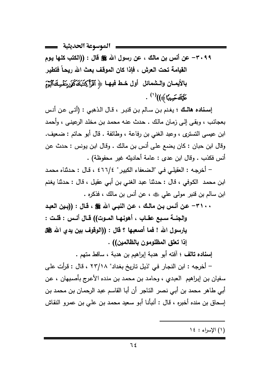 ٣٠٩٩ - عن أنس بن مالك، عن رسول الله - صلي الله عليه وسلم - قال: "الكتب كلها يوم القيامة تحت العرش، فإذا كان الموقف بعث الله ريحًا فتطير بالأيمان والشمائل أول خط فيها {اقْرَأْ كِتَابَكَ كَفَى بِنَفْسِكَ الْيَوْمَ عَلَيْكَ حَسِيبًا} " (¬١).
