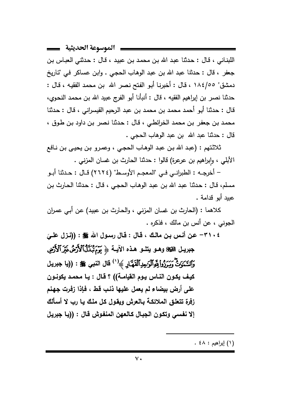 ٣١٠٤ - عن أنس بن مالك، قال: قال رسول الله - صلي الله عليه وسلم -: "نزل علي جبريل - عليه السلام - وهو يتلو هذه الآية {يَوْمَ تُبَدَّلُ الْأَرْضُ غَيْرَ الْأَرْضِ وَالسَّمَاوَاتُ وَبَرَزُوا لِلَّهِ الْوَاحِدِ الْقَهَّارِ} (¬١) قال النبي - صلي الله عليه وسلم -: "يا جبريل كيف يكون الناس يوم القيامة"؟ قال: يا محمد يكونون على أرض بيضاء لم يعمل عليها ذنب قط، فإذا زفرت جهنم زفرة تتعلق الملائكة بالعرش ويقول كل مالك يا رب لا أسألك إلا نفسي وتكون الجبال كالعهن المنفوش قال: "يا جبريل