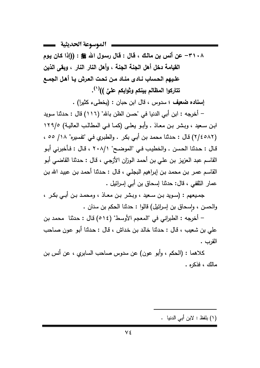 ٣١٠٨ - عن أنس بن مالك، قال: قال رسول الله - صلي الله عليه وسلم -: "إذا كان يوم القيامة دخل أهل الجنة الجنة، وأهل النار النار، وبقى الذين عليهم الحساب نادى مناد من تحت العرش يا أهل الجمع تتاركوا المظالم بينكم وثوابكم عليَّ" (¬١).