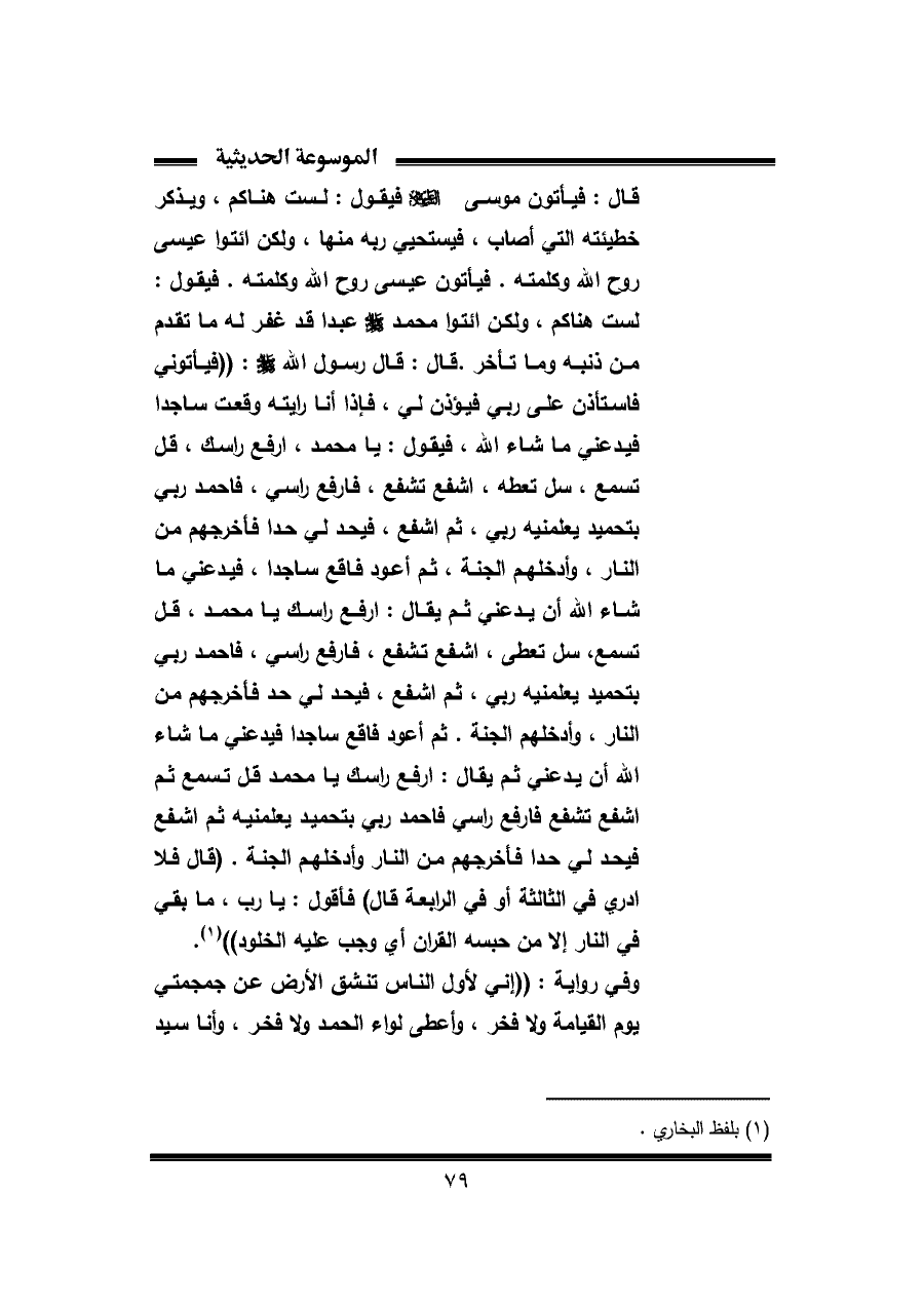 قال: فيأتون موسى - عليه السلام - فيقول: لست هناكم، ويذكر خطيئته التي أصاب، فيستحيي ربه منها، ولكن ائتوا عيسى روح الله وكلمته. فيأتون عيسى روح الله وكلمته. فيقول: لست هناكم، ولكن ائتوا محمد - صلى الله عليه وسلم - عبدا قد غفر له ما تقدم من ذنبه وما تأخر. قال: قال رسول الله - صلي الله عليه وسلم -: "فيأتوني فأستأذن على ربي فيؤذن لي، فإذا أنا رأيته وقعت ساجدا فيدعني ما شاء الله، فيقول: يا محمد، ارفع راسك، قل تسمع، سل تعطه، اشفع تشفع، فأرفع راسي، فاحمد ربي بتحميد يعلمنيه ربي، ثم اشفع، فيحد لي حدا فأخرجهم من النار، وأدخلهم الجنة، ثم أعود فأقع ساجدا، فيدعني ما شاء الله أن يدعني ثم يقال: ارفع راسك يا محمد، قل تسمع، سل تعطى، اشفع تشفع، فارفع راسي، فأحمد ربي بتحميد يعلمنيه ربي، ثم اشفع، فيحد لي حد فأخرجهم من النار، وأدخلهم الجنة. ثم أعود فأقع ساجدا فيدعني ما شاء الله أن يدعني ثم يقال: ارفع رأسك يا محمد قل تسمع ثم اشفع تشفع فأرفع راسي فأحمد ربي بتحميد يعلمنيه ثم اشفع فيحد لي حدا فأخرجهم من النار وأدخلهم الجنة. (قال فلا أدري في الثالثة أو في الرابعة قال) فأقول: يا رب، ما بقي في النار إلا من حبسه القران أي وجب عليه الخلود" (¬١).
