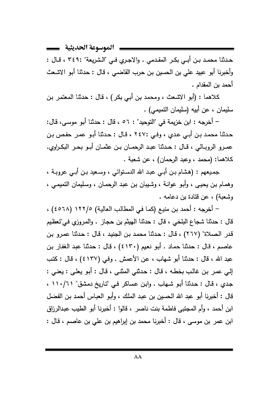 حدثنا محمد بن أبي بكر المقدمي. والاجري في "الشريعة":٣٤٩، قال: وأخبرنا أبو عبيد علي بن الحسين بن حرب القاضي، قال: حدثنا أبو الأشعث أحمد بن المقدام.