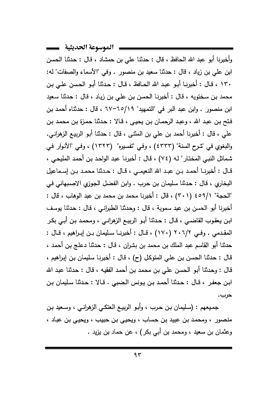 وأخبرنا أبو عبد الله الحافظ، قال: حدثنا علي بن حمشاد، قال: حدثنا الحسن بن علي بن زياد، قال: حدثنا سعيد بن منصور. وفي "الأسماء والصفات" له: ١٣٠، قال: أخبرنا أبو عبد الله الحافظ، قال: حدثنا أبو الحسن علي بن محمد بن سختويه، قال: أخبرنا الحسن بن علي بن زياد، قال: حدثنا سعيد بن منصور. وابن عبد البر في "التمهيد" ١٩/ ٦٥ - ٦٧، قال: حدثناه أحمد بن فتح بن عبد الله، وعبد الرحمان بن يحيى، قال: حدثنا حمزة بن محمد بن علي، قال: أخبرنا أحمد بن علي بن المثنى، قال: حدثنا أبو الربيع الزهراني. والبغوي في "شرح السنة" (٤٣٣٣)، وفي "تفسيره" (١٣٢٣)، وفي "الأنوار في شمائل النبي المختار" له (٧٤)، قال: أخبرنا عبد الواحد بن أحمد المليحي، قال: أخبرنا أحمد بن عبد الله النعيمي، قال: حدثنا محمد بن إسماعيل البخاري، قال: حدثنا سليمان بن حرب. وابن الفضل الجوزي الأصبهاني في "الحجة" ١/ ٤٥٩ (٣٠١)، قال: أخبرنا محمد بن محمد بن عبد الوهاب، قال: أخبرنا أبو الحسن بن عبد سموية، قال: وحدثنا الطبراني، قال: حدثنا يوسف بن يعقوب القاضي، قال: حدثنا أبو الربيع الزهراني، ومحمد بن أبي بكر المقدمي. وفي ٢/ ٢٠٦ (١٧٠)، قال: أخبرنا سليمان بن إبراهيم، قال: حدثنا أبو القاسم عبد الملك بن محمد بن بشران، قال: حدثنا دعلج بن أحمد، قال: حدثنا الحسن بن علي المتوكل (ح)، قال: أخبرنا سليمان بن إبراهيم، قال: وحدثنا أبو الحسن علي بن محمد بن أحمد الفقيه، قال: حدثنا عبد الله بن جعفر، قال: حدثنا أحمد بن يونس الضبي. قال: حدثنا سليمان بن حرب.