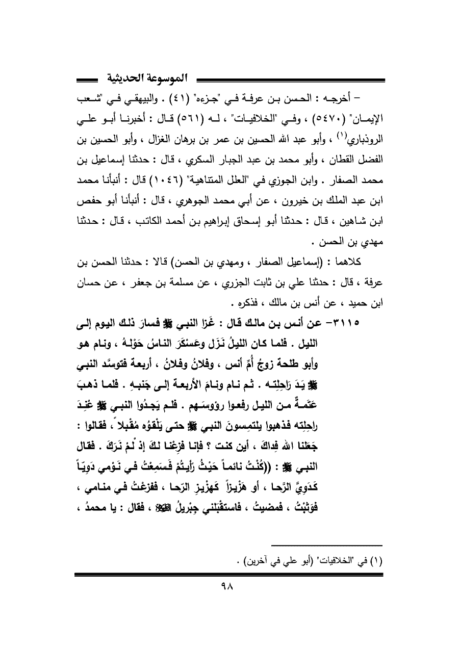 ٣١١٥ - عن أنس بن مالك قال: غَزا النبي - صلى الله عليه وسلم - فسارَ ذلك اليوم إلى الليل. فلما كان الليلُ نَزَل وعَسْكَرَ الناسُ حَوْلهُ، ونام هو وأبو طلحة زوجُ أُمِّ أنس، وفلانُ وفلانُ، أربعة فتوسَّد النبي - صلى الله عليه وسلم - يَدَ رَاحِلِته. ثم نام ونامَ الأربعة إلى جَنبهِ. فلما ذهبَ عَتَمةٌ من الليل رفعوا رؤوسَهم. فلم يَجدُوا النبي - صلى الله عليه وسلم - عْنِدَ راحِلِته فذهبوا يلتمِسونَ النبي - صلى الله عليه وسلم - حتى يَلْقوه مُقْبلًا، فقالوا: جَعَلنا الله فِداكَ، أين كنت؟ فإنا فزِعْنا لكَ إذْ لمْ نَرَكَ. فقال النبي - صلى الله عليه وسلم -: "كُنْتُ نائمًا حَيْثُ رأيتُمْ فَسَمِعْتُ في نَوْمي دَوِيًّا كَدَوِيِّ الرَّحا، أو هَزْيزًا كَهزْيزِ الرّحا، ففزعْتُ في منامي، فوَثبْتُ، فمضيتُ، فاستقْبَلني جِبْريلُ - عليه السلام -، فقال: يا محمدُ،