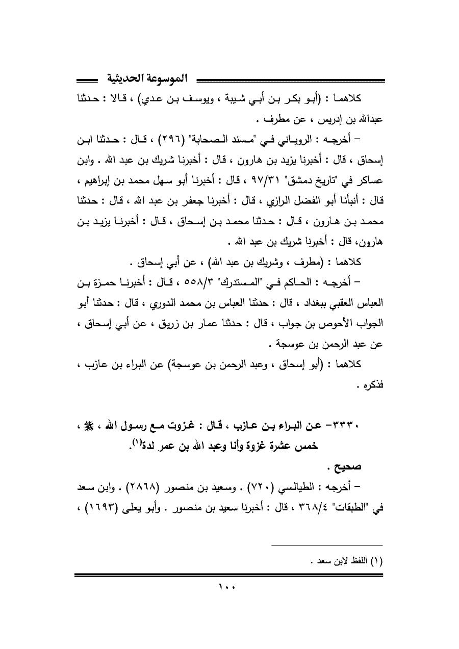 ٣٣٣٠ - عن البراء بن عازب، قال: غزوت مع رسول الله، - صلى الله عليه وسلم -، خمس عشرة غزوة وأنا وعبد الله بن عمر لدة (¬١).