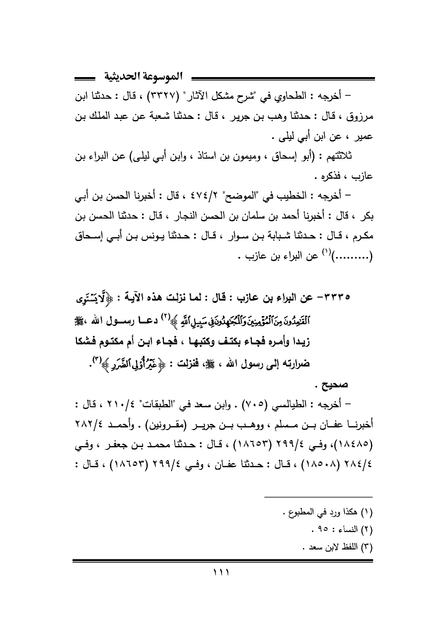 ٣٣٣٥ - عن البراء بن عازب: قال: لما نزلت هذه الآية: {لَا يَسْتَوِي الْقَاعِدُونَ مِنَ الْمُؤْمِنِينَ وَالْمُجَاهِدُونَ فِي سَبِيلِ اللَّهِ} (¬٢) دعا رسول الله - صلى الله عليه وسلم -، زيدا وأمره فجاء بكتف وكتبها، فجاء ابن أم مكتوم فشكا ضرارته إلى رسول الله، - صلى الله عليه وسلم -، فنزلت: {غَيْرُ أُولِي الضَّرَرِ} (¬٣).