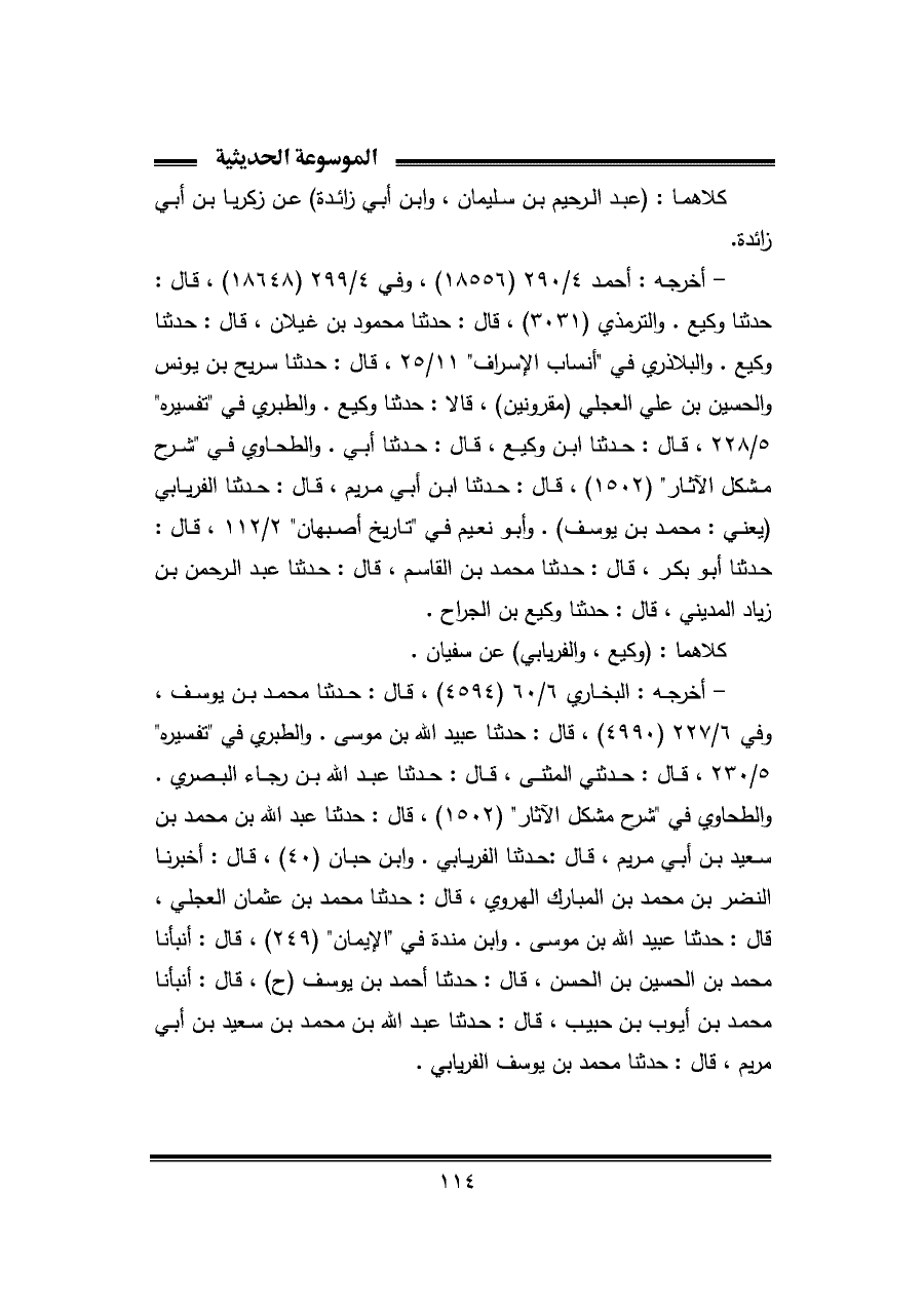 كلاهما: (عبد الرحيم بن سليمان، وابن أبي زائدة) عن زكريا بن أبي زائدة. - أخرجه: أحمد ٤/ ٢٩٠ (١٨٥٥٦)، وفي ٤/ ٢٩٩ (١٨٦٤٨)، قال: حدثنا وكيع. والترمذي (٣٠٣١)، قال: حدثنا محمود بن غيلان، قال: حدثنا وكيع. والبلاذري في "أنساب الإسراف" ١١/ ٢٥، قال: حدثنا سريح بن يونس والحسين بن علي العجلي (مقرونين)، قالا: حدثنا وكيع. والطبري في "تفسيره" ٥/ ٢٢٨، قال: حدثنا ابن وكيع، قال: حدثنا أبي. والطحاوي في "شرح مشكل الآثار" (١٥٠٢)، قال: حدثنا ابن أبي مريم، قال: حدثنا الفريابي (يعني: محمد بن يوسف). وأبو نعيم في "تاريخ أصبهان" ٢/ ١١٢، قال: حدثنا أبو بكر، قال: حدثنا محمد بن القاسم، قال: حدثنا عبد الرحمن بن زياد المديني، قال: حدثنا وكيع بن الجراح.