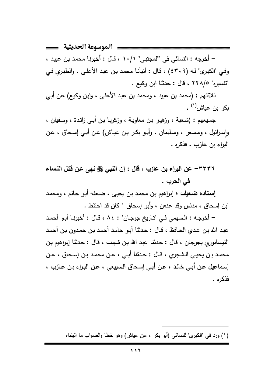 ٣٣٣٦ - عن البراء بن عازب، قال: إن النبي - صلى الله عليه وسلم - نهى عن قتل النساء في الحرب.
