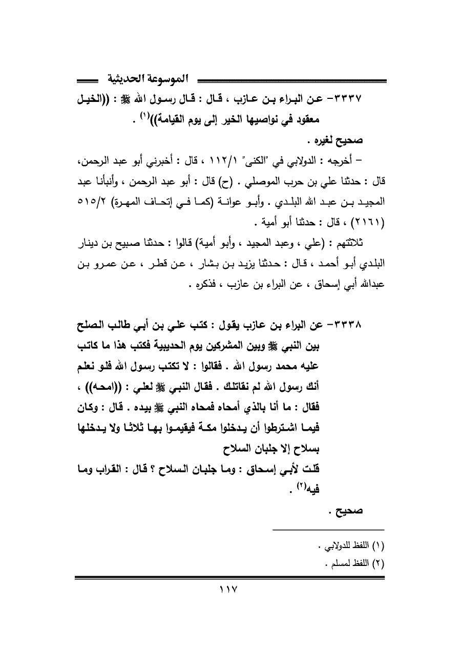 ٣٣٣٨ - عن البراء بن عازب يقول: كتب علي بن أبي طالب الصلح بين النبي - صلى الله عليه وسلم - وبين المشركين يوم الحديبية فكتب هذا ما كاتب عليه محمد رسول الله. فقالوا: لا تكتب رسول الله فلو نعلم أنك رسول الله لم نقاتلك. فقال النبي - صلى الله عليه وسلم - لعلي: "امحه"، فقال: ما أنا بالذي أمحاه فمحاه النبي - صلى الله عليه وسلم - بيده. قال: وكان فيما اشترطوا أن يدخلوا مكة فيقيموا بها ثلاثا ولا يدخلها بسلاح إلا جلبان السلاح.