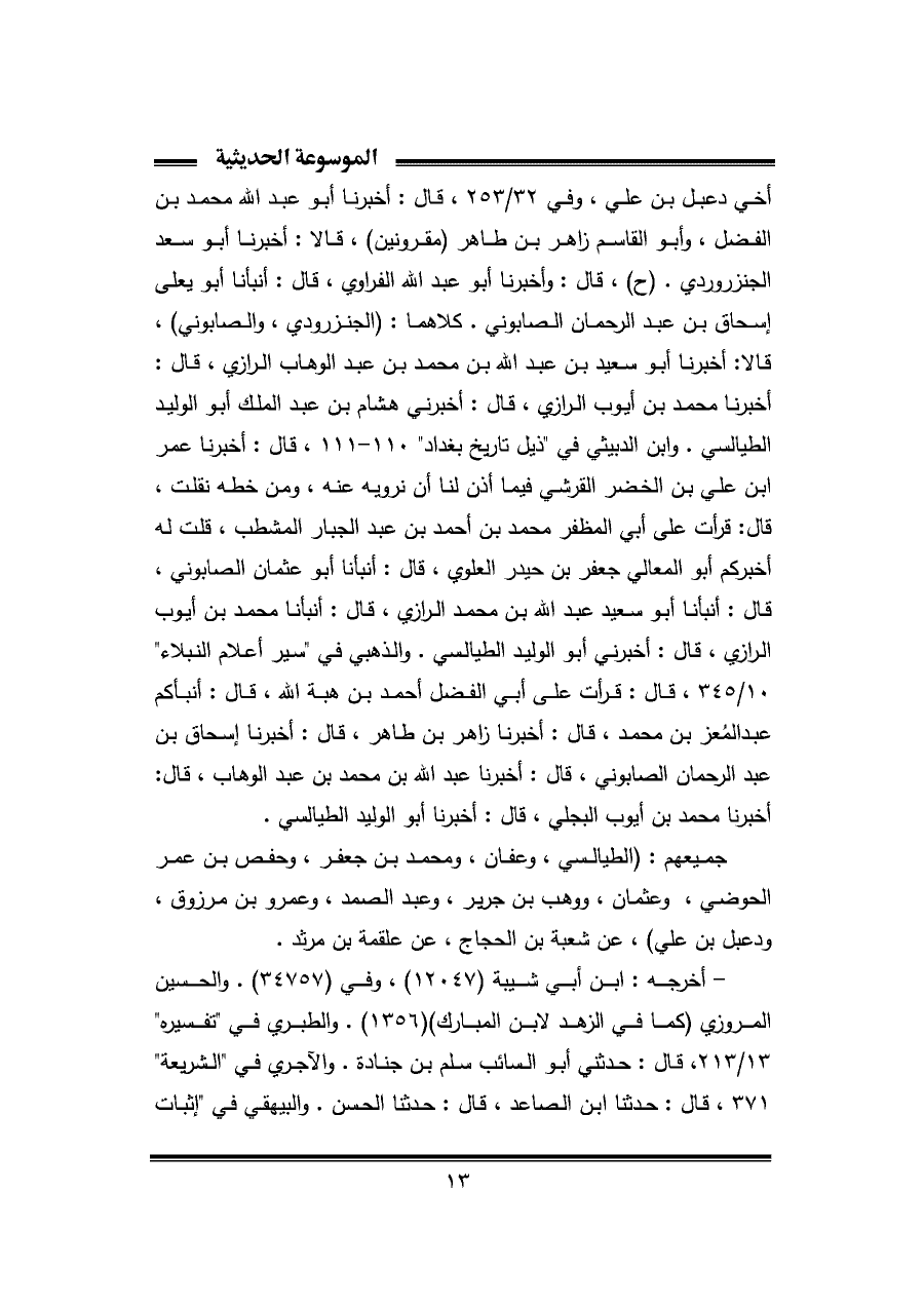 أخي دعبل بن علي، وفي ٣٢/ ٢٥٣، قال: أخبرنا أبو عبد الله محمد بن الفضل، وأبو القاسم زاهر بن طاهر (مقرونين)، قالا: أخبرنا أبو سعد الجنزروردي. (ح)، قال: وأخبرنا أبو عبد الله الفراوي، قال: أنبأنا أبو يعلى إسحاق بن عبد الرحمان الصابوني. كلاهما: (الجنزرودي، والصابوني)، قالا: أخبرنا أبو سعيد بن عبد الله بن محمد بن عبد الوهاب الرازي، قال: أخبرنا محمد بن أيوب الرازي، قال: أخبرني هشام بن عبد الملك أبو الوليد الطيالسي. وابن الدبيثي في "ذيل تاريخ بغداد" ١١٠ - ١١١، قال: أخبرنا عمر بن علي بن الخضر القرشي فيما أذن لنا أن نرويه عنه، ومن خطه نقلت، قال: قرأت على أبي المظفر محمد بن أحمد بن عبد الجبار المشطب، قلت له أخبركم أبو المعالي جعفر بن حيدر العلوي، قال: أنبأنا أبو عثمان الصابوني، قال: أنبأنا أبو سعيد عبد الله بن محمد الرازي، قال: أنبأنا محمد بن أيوب الرازي، قال: أخبرني أبو الوليد الطيالسي. والذهبي في "سير أعلام النبلاء" ١٠/ ٣٤٥، قال: قرأت على أبي الفضل أحمد بن هبة الله، قال: أنبأكم عبد المُعز بن محمد، قال: أخبرنا زاهر بن طاهر، قال: أخبرنا إسحاق بن عبد الرحمان الصابوني، قال: أخبرنا عبد الله بن محمد بن عبد الوهاب، قال: أخبرنا محمد بن أيوب البجلي، قال: أخبرنا أبو الوليد الطيالسي.