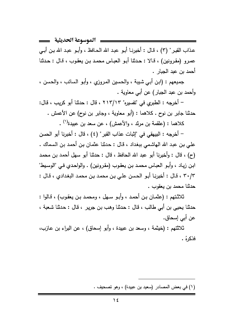 عذاب القبر" (٣)، قال: أخبرنا أبو عبد الله الحافظ، وأبو عبد الله بن أبي عمرو (مقرونين)، قالا: حدثنا أبو العباس محمد بن يعقوب، قال: حدثنا أحمد بن عبد الجبار.