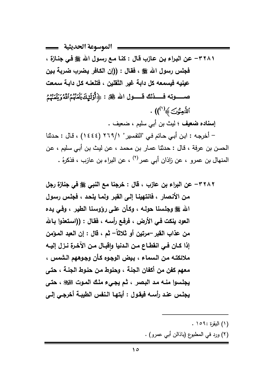 ٣٢٨١ - عن البراء بن عازب قال: كنا مع رسول الله - صلى الله عليه وسلم - في جنازة، فجلس رسول الله - صلى الله عليه وسلم -، فقال: "إن الكافر يضرب ضربة بين عينيه فيسمعه كل دابة غير الثقلين، فتلعنه كل دابة سمعت صوته فذلك قول الله - عز وجل -: {أُولَئِكَ يَلْعَنُهُمُ اللَّهُ وَيَلْعَنُهُمُ اللَّاعِنُونَ} (¬١).