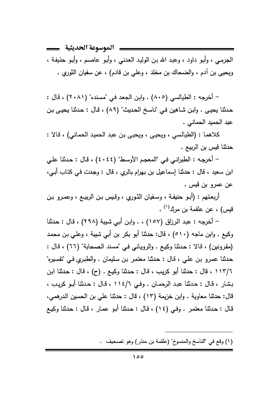 أربعتهم: (أبو حنيفة، وسفيان الثوري، وقيس بن الربيع، وعمرو بن قيس)، عن علقمة بن مرثد (¬١).