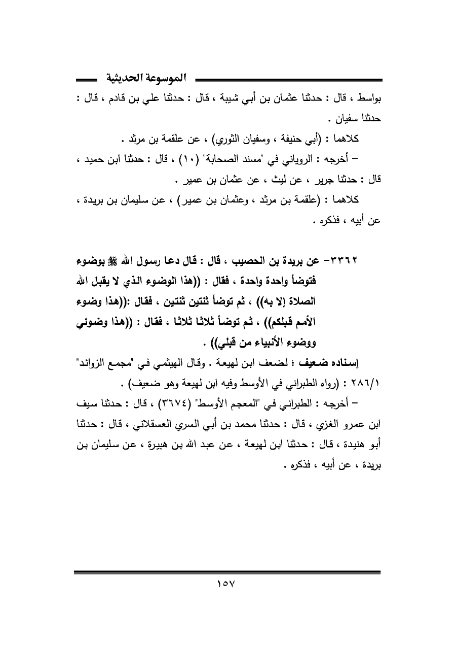 ٣٣٦٢ - عن بريدة بن الحصيب، قال: قال دعا رسول الله - صلى الله عليه وسلم - بوضوء فتوضأ واحدة واحدة، فقال: "هذا الوضوء الذي لا يقبل الله الصلاة إلا به"، ثم توضأ ثنتين ثنتين، فقال: "هذا وضوء الأمم قبلكم"، ثم توضأ ثلاثا ثلاثا، فقال: "هذا وضوئي ووضوء الأنبياء من قبلي".