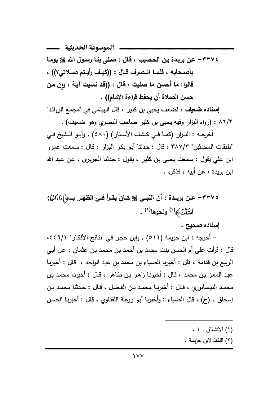 ٣٣٧٥ - عن بريدة: أن النبي - صلى الله عليه وسلم - كان يقرأ في الظهر بـ {إِذَا السَّمَاءُ انْشَقَّتْ} (¬١) ونحوها (¬٢).