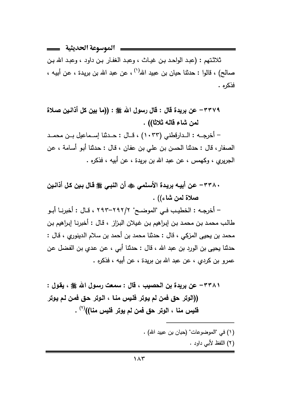 ٣٣٨١ - عن بريدة بن الحصيب، قال: سمعت رسول الله - صلى الله عليه وسلم -، يقول: ((الوتر حق فمن لم يوتر فليس منا، الوتر حق فمن لم يوتر فليس منا، الوتر حق فمن لم يوتر فليس منا)) (¬٢).