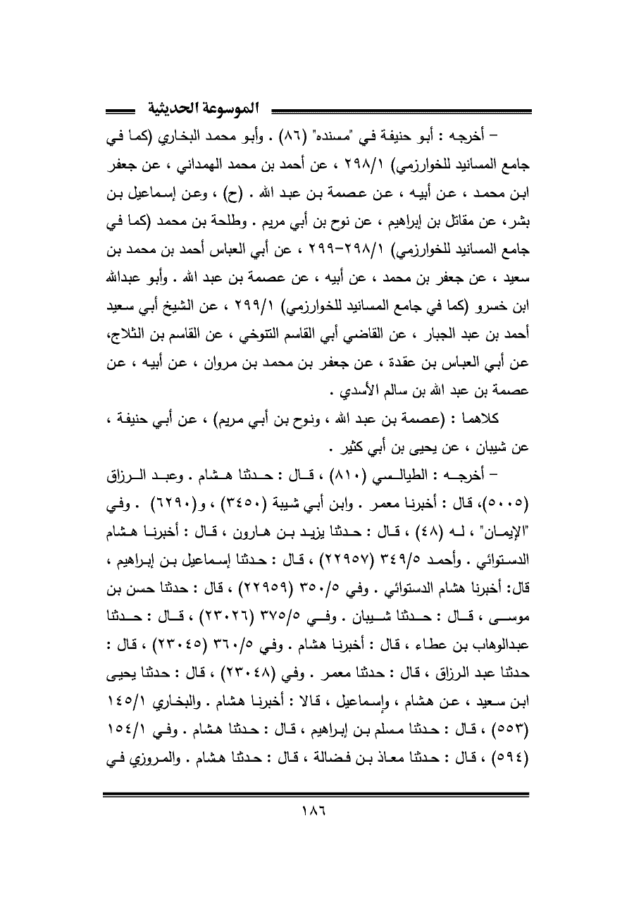 - أخرجه: أبو حنيفة في "مسنده" (٨٦). وأبو محمد البخاري (كما في جامع المسانيد للخوارزمي) ١/ ٢٩٨، عن أحمد بن محمد الهمداني، عن جعفر بن محمد، عن أبيه، عن عصمة بن عبد الله. (ح)، وعن إسماعيل بن بشر، عن مقاتل بن إبراهيم، عن نوح بن أبي مريم. وطلحة بن محمد (كما في جامع المسانيد للخوارزمي) ١/ ٢٩٨ - ٢٩٩، عن أبي العباس أحمد بن محمد بن سعيد، عن جعفر بن محمد، عن أبيه، عن عصمة بن عبد الله. وأبو عبد الله بن خسرو (كما في جامع المسانيد للخوارزمي) ١/ ٢٩٩، عن الشيخ أبي سعيد أحمد بن عبد الجبار، عن القاضي أبي القاسم التنوخي، عن القاسم بن الثلاج، عن أبي العباس بن عقدة، عن جعفر بن محمد بن مروان، عن أبيه، عن عصمة بن عبد الله بن سالم الأسدي.