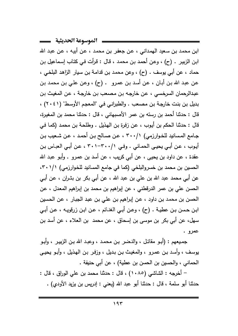 ابن محمد بن سعيد الهمداني، عن جعفر بن محمد، عن أبيه، عن عبد الله بن الزبير. (ح)، وعن أحمد بن محمد، قال: قرأت في كتاب إسماعيل بن حماد، عن أبي يوسف. (ح)، وعن محمد بن قدامة بن سيار الزاهد البلخي، عن عبد الله بن أبان، عن أسد بن عمرو. (ح)، وعن علي بن محمد بن عبد الرحمان السرخسي، عن خارجة بن مصعب بن خارجة، عن المغيث بن بديل بن بنت خارجة بن مصعب. والطبراني في "المعجم الأوسط" (٢٠٤١)، قال: حدثنا أحمد بن رسته بن عمر الأصبهاني، قال: حدثنا محمد بن المغيرة، قال: حدثنا الحكم بن أيوب، عن زفرة بن الهذيل. وطلحة بن محمد (كما في جامع المسانيد للخوارزمي) ١/ ٣٠٠، عن صالح بن أحمد، عن شعيب بن أيوب، عن أبي يحيى الحماني. وفي ١/ ٣٠٠ - ٣٠١، عن أبي العباس بن عقدة، عن داود بن يحيى، عن أبي كريب، عن أسد بن عمرو. وأبو عبد الله الحسين بن محمد بن خسرو البلخي (كما في جامع المسانيد للخوارزمي) ١/ ٣٠١، عن أبي محمد عبد الله بن علي بن عبد الله، عن أبي بكر بن بشران، عن أبي الحسن علي بن عمر الدارقطني، عن إبراهيم بن محمد بن إبراهيم المعدل، عن الحسن بن محمد بن داود، عن إبراهيم بن علي بن عبد الجبار، عن الحسين بن حسن بن عطية. (ح)، وعن أبي الغنائم، عن ابن زرقويه، عن أبي سهل، عن أبي بكر بن موسى بن إسحاق، عن محمد بن العلاء، عن أسد بن عمرو.
