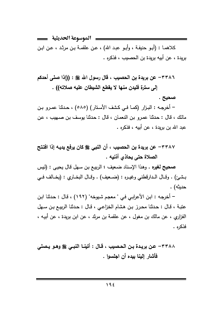 ٣٣٨٨ - عن بريدة بن الحصيب، قال: أتينا النبي - صلى الله عليه وسلم - وهو يصلي فأشار إلينا بيده أن اجلسوا.