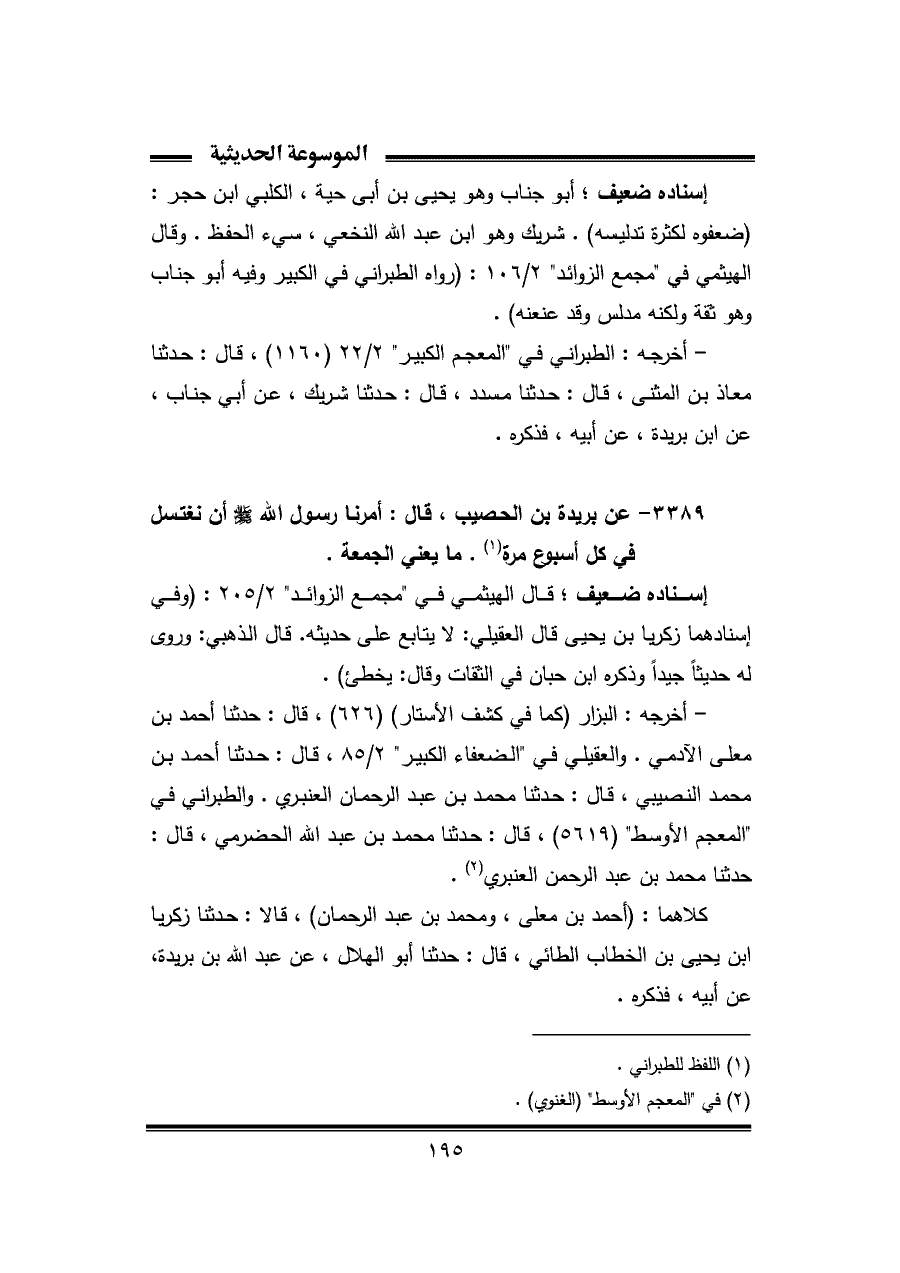 ٣٣٨٩ - عن بريدة بن الحصيب، قال: أمرنا رسول الله - صلى الله عليه وسلم - أن نغتسل في كل أسبوع مرة (¬١). ما يعني الجمعة.