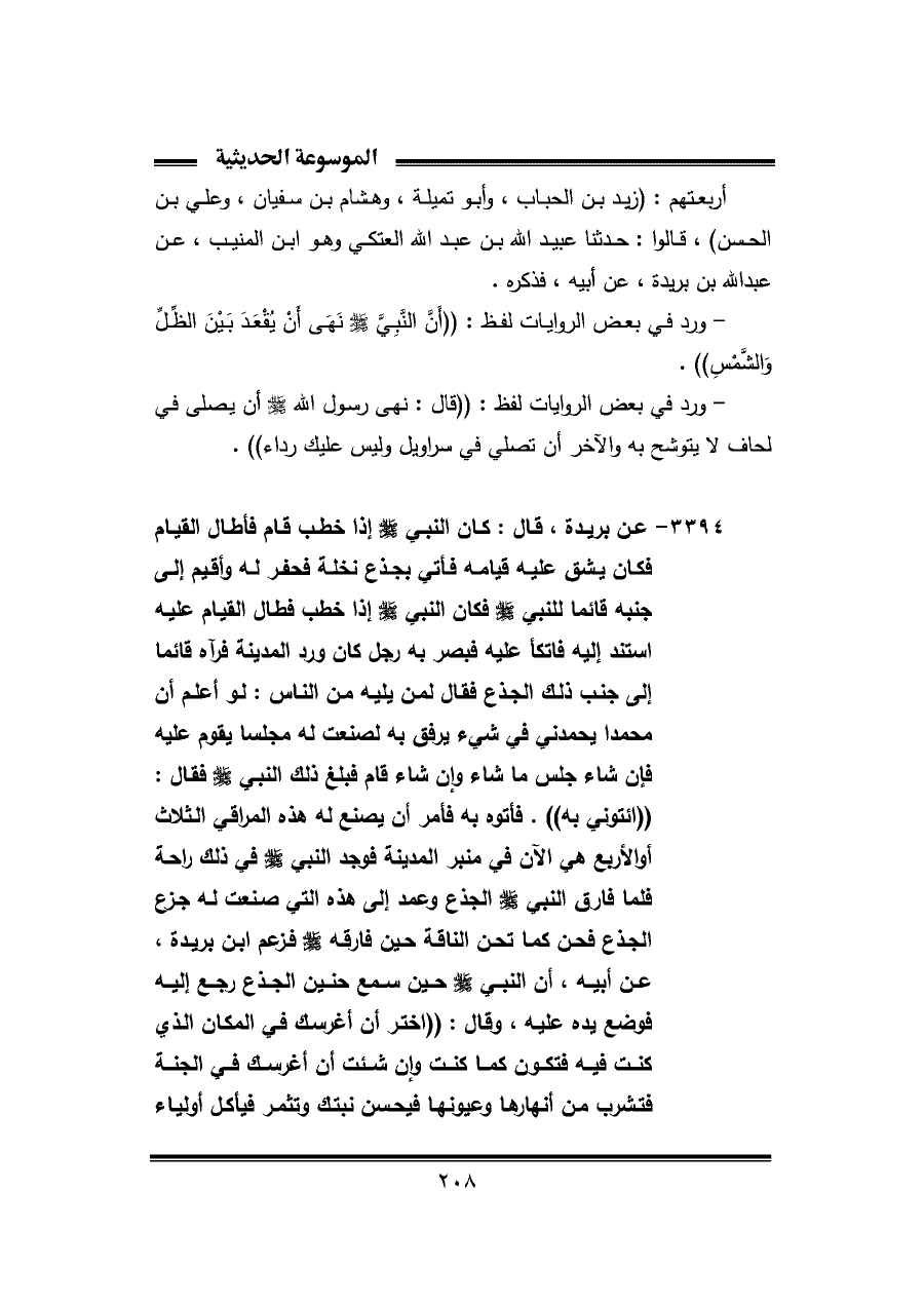 ٣٣٩٤ - عن بريدة، قال: كان النبي - صلى الله عليه وسلم - إذا خطب قام فأطال القيام فكان يشق عليه قيامه فأتي بجذع نخلة فحفر له وأقيم إلى جنبه قائما للنبي - صلى الله عليه وسلم - فكان النبي - صلى الله عليه وسلم - إذا خطب فطال القيام عليه استند إليه فاتكأ عليه فبصر به رجل كان ورد المدينة فرآه قائما إلى جنب ذلك الجذع فقال لمن يليه من الناس: لو أعلم أن محمدا يحمدني في شيء يرفق به لصنعت له مجلسا يقوم عليه فإن شاء جلس ما شاء وإن شاء قام فبلغ ذلك النبي - صلى الله عليه وسلم - فقال: ((ائتوني به)). فأتوه به فأمر أن يصنع له هذه المراقي الثلاث أو الأربع هي الآن في منبر المدينة فوجد النبي - صلى الله عليه وسلم - في ذلك راحة فلما فارق النبي - صلى الله عليه وسلم - الجذع وعمد إلى هذه التي صنعت له جزع الجذع فحن كما تحن الناقة حين فارقه - صلى الله عليه وسلم - فزعم ابن بريدة، عن أبيه، أن النبي - صلى الله عليه وسلم - حين سمع حنين الجذع رجع إليه فوضع يده عليه، وقال: ((اختر أن أغرسك في المكان الذي كنت فيه فتكون كما كنت وإن شئت أن أغرسك في الجنة فتشرب من أنهارها وعيونها فيحسن نبتك وتثمر فيأكل أولياء