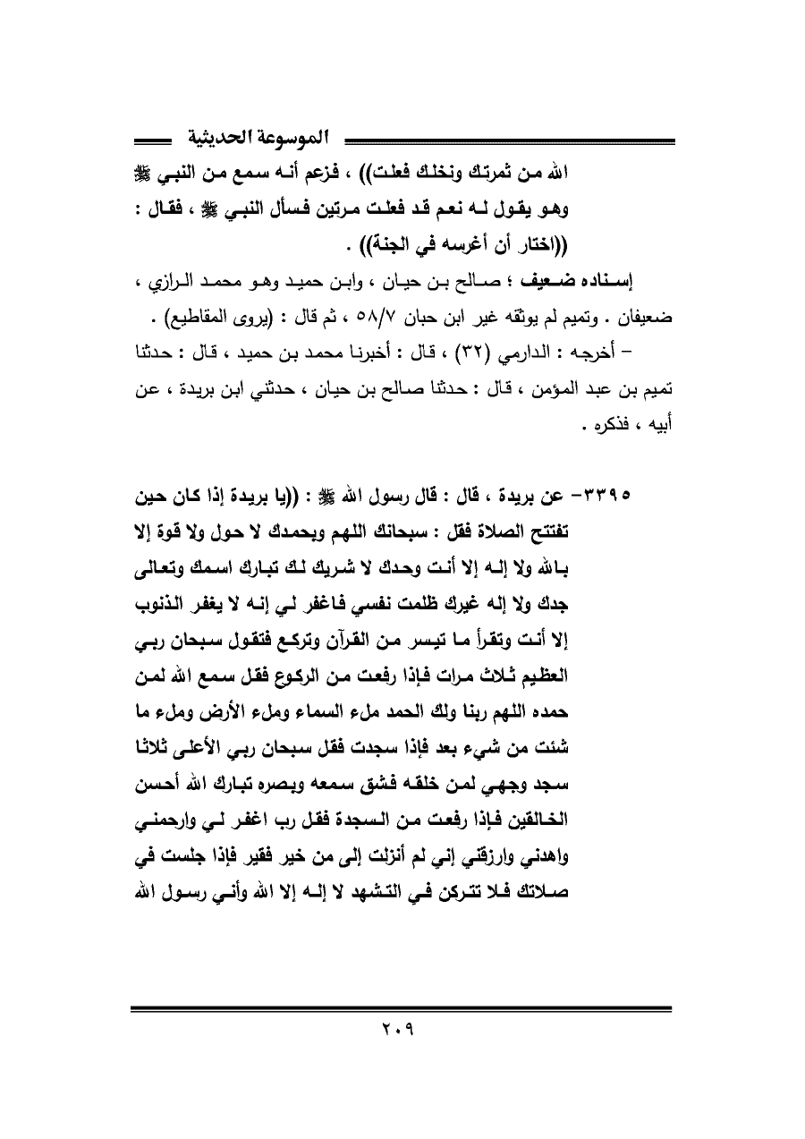 ٣٣٩٥ - عن بريدة، قال: قال رسول الله - صلى الله عليه وسلم -: ((يا بريدة إذا كان حين تفتتح الصلاة فقل: سبحانك اللهم وبحمدك لا حول ولا قوة إلا بالله ولا إله إلا أنت وحدك لا شريك لك تبارك اسمك وتعالى جدك ولا إله غيرك ظلمت نفسي فاغفر لي إنه لا يغفر الذنوب إلا أنت وتقرأ ما تيسر من القرآن وتركع فيقول سبحان ربي العظيم ثلاث مرات فإذا رفعت من الركوع فقل سمع الله لمن حمده اللهم ربنا ولك الحمد ملء السماء وملء الأرض وملء ما شئت من شيء بعد فإذا سجدت فقل سبحان ربي الأعلى ثلاثا سجد وجهي لمن خلقه فشق سمعه وبصره تبارك الله أحسن الخالقين فإذا رفعت من السجدة فقل رب اغفر لي وارحمني واهدني وارزقني إني لم أنزلت إلى من خير فقير فإذا جلست في صلاتك فلا تتركن في التشهد لا إله إلا الله وأني رسول الله