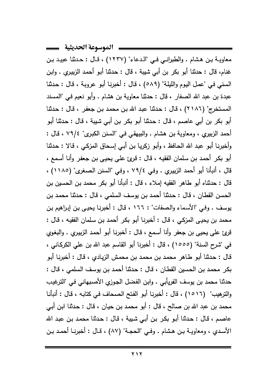 معاوية بن هشام. والطبراني في "الدعاء" (١٢٣٧)، قال: حدثنا عبيد بن غنام، قال: حدثنا أبو بكر بن أبي شيبة، قال: حدثنا أبو أحمد الزبيري. وابن السني في "عمل اليوم والليلة" (٥٨٩)، قال: أخبرنا أبو عروبة، قال: حدثنا عبدة بن عبد الله الصفار، قال: حدثنا معاوية بن هشام. وأبو نعيم في "المسند المستخرج" (٢١٨٦)، قال: حدثنا عبد الله بن محمد بن جعفر، قال: حدثنا أبو بكر بن أبي عاصم، قال: حدثنا أبو بكر بن أبي شيبة، قال: حدثنا أبو أحمد الزبيري، ومعاوية بن هشام. والبيهقي في "السنن الكبرى" ٤/ ٧٩، قال: وأخبرنا أبو عبد الله الحافظ، وأبو زكريا بن أبي إسحاق المزكي، قالا: حدثنا أبو بكر أحمد بن سلمان الفقيه، قال: قرئ على يحيى بن جعفر وأنا أسمع، قال، أنبأنا أبو أحمد الزبيري. وفي ٤/ ٧٩، وفي "السنن الصغرى" (١١٨٥)، قال: حدثناه أبو طاهر الفقيه إملاء، قال: أنبأنا أبو بكر محمد بن الحسين بن الحسن القطان، قال: حدثنا أحمد بن يوسف السلمي، قال: حدثنا محمد بن يوسف. وفي "الأسماء والصفات": ١٦٦، قال: أخبرنا يحيى بن إبراهيم بن محمد بن يحيى المزكي، قال: أخبرنا أبو بكر أحمد بن سلمان الفقيه، قال: قرئ على يحيى بن جعفر وأنا أسمع، قال: أخبرنا أبو أحمد الزبيري. والبغوي في "شرح السنة" (١٥٥٥)، قال: أخبرنا أبو القاسم عبد الله بن علي الكركاني، قال: حدثنا أبو طاهر محمد بن محمد بن محمش الزيادي، قال: أخبرنا أبو بكر محمد بن الحسين القطان، قال: حدثنا أحمد بن يوسف السلمي، قال: حدثنا محمد بن يوسف الفريأبي. وابن الفضل الجوزي الأصبهاني في "الترغيب والترهيب" (١٥١٦)، قال: أخبرنا أبو الفتح الصحاف في كتابه، قال: أنبأنا محمد بن عبد الله بن صالح، قال: أبو محمد بن حيان، قال: حدثنا ابن أبي عاصم، قال: حدثنا أبو بكر بن أبي شيبة، قال: حدثنا محمد بن عبد الله الأسدي، ومعاوية بن هشام. وفي "الحجة" (٨٧)، قال: أخبرنا أحمد بن