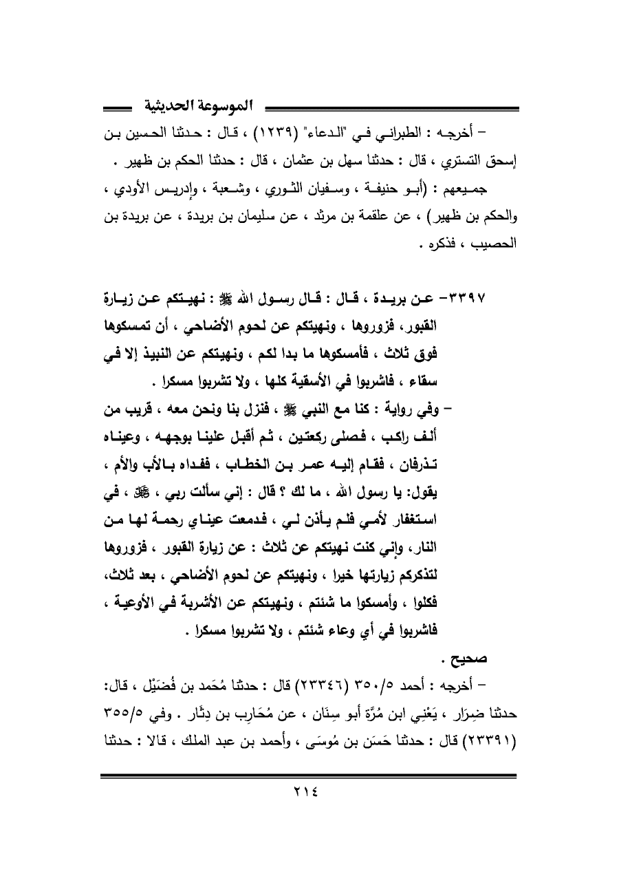 ٣٣٩٧ - عن بريدة، قال: قال رسول الله - صلى الله عليه وسلم -: نهيتكم عن زيارة القبور، فزوروها، ونهيتكم عن لحوم الأضاحي، أن تمسكوها فوق ثلاث، فأمسكوها ما بدا لكم، ونهيتكم عن النبيذ إلا في سقاء، فاشربوا في الأسقية كلها، ولا تشريوا مسكرا.
