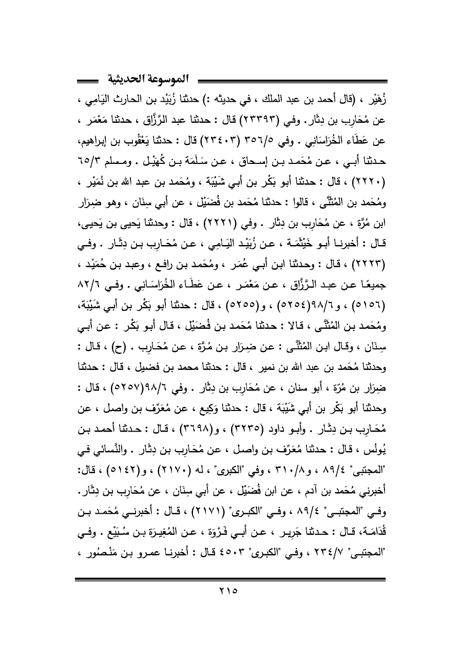 زُهَيْر، (قال أحمد بن عبد الملك، في حديثه:) حدثنا زُبَيْد بن الحارث اليَامِي، عن مُحَارِب بن دِثَار. وفي (٢٣٣٩٣) قال: حدثنا عبد الرَّزَّاق، حدثنا مَعْمَر، عن عَطَاء الخُرَاسَانِي. وفي ٥/ ٣٥٦ (٢٣٤٠٣) قال: حدثنا يَعْقُوب بن إبراهيم، حدثنا أبي، عن مُحَمد بن إسحاق، عن سَلَمَة بن كُهَيْل. ومسلم ٣/ ٦٥ (٢٢٢٠)، قال: حدثنا أبو بَكْر بن أبي شَيْبَة، ومُحَمد بن عبد الله بن نُمَيْر، ومُحَمد بن المُثَنَّى، قالوا: حدثنا مُحَمد بن فُضَيْل، عن أبي سِنَان، وهو ضِرَار بن مُرَّة، عن مُحَارِب بن دِثَار. وفي (٢٢٢١)، قال: وحدثنا يَحيى بن يَحيى، قال: أخبرنا أبو خَيْثَمَة، عن زُبَيْد اليَامِي، عن مُحَارِب بن دِثَار. وفي (٢٢٢٣)، قال: وحدثنا ابن أبي عُمَر، ومُحَمد بن رافع، وعبد بن حُمَيْد، جميعًا عن عبد الرَّزَّاق، عن مَعْمَر، عن عَطَاء الخُرَاسَانِي. وفي ٦/ ٨٢ (٥١٥٦)، و ٦/ ٩٨ (٥٢٥٤)، و (٥٢٥٥)، قال: حدثنا أبو بَكْر بن أبي شَيْبَة، ومُحَمد بن المُثَنَّى، قالا: حدثنا مُحَمد بن فُضَيْل، قال أبو بَكْر: عن أبي سِنَان، وقال ابن المُثَنَّى: عن ضِرَار بن مُرَّة، عن مُحَارِب. (ح)، قال: وحدثنا مُحَمد بن عبد الله بن نمير، قال: حدثنا محمد بن فضيل، قال: حدثنا ضِرَار بن مُرّة، أبو سنان، عن مُحَارِب بن دِثَار. وفي ٦/ ٩٨ (٥٢٥٧)، قال: وحدثنا أبو بَكْر بن أبي شَيْبَة، قال: حدثنا وَكِيع، عن مُعَرِّف بن واصل، عن مُحَارِب بن دِثَار. وأبو داود (٣٢٣٥)، و (٣٦٩٨)، قال: حدثنا أحمد بن يُونُس، قال: حدثنا مُعَرِّف بن واصل، عن مُحَارِب بن دِثَار. والنَّسائي في "المجتبى" ٤/ ٨٩، و ٨/ ٣١٠، وفي "الكبرى"، له (٢١٧٠)، و (٥١٤٢)، قال: أخبرني مُحَمد بن آدم، عن ابن فُضَيْل، عن أبي سِنَان، عن مُحَارِب بن دِثَار. وفي "المجتبى" ٤/ ٨٩، وفي "الكبرى" (٢١٧١)، قال: أخبرني مُحَمد بن قُدَامَة، قال: حدثنا جَرِير، عن أبي فَرْوَة، عن المُغِيرَة بن سُبَيْع. وفي "المجتبى" ٧/ ٢٣٤، وفي "الكبرى" ٤٥٠٣ قال: أخبرنا عمرو بن مَنْصُور،