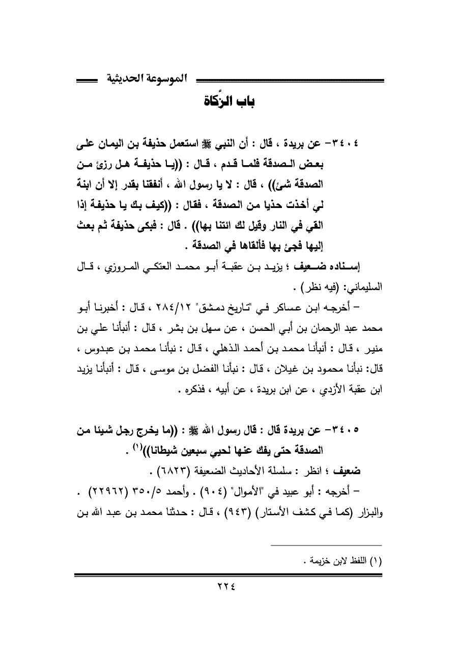 ٣٤٠٥ - عن بريدة قال: قال رسول الله - صلى الله عليه وسلم -: ((ما يخرج رجل شيئًا من الصدقة حتى يفك عنها لحيي سبعين شيطانًا)) (¬١).