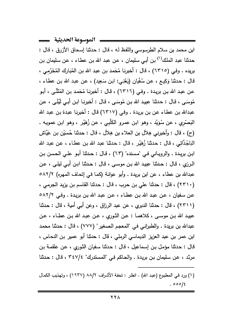 ابن محمد بن سلام الطرسوسي واللفظ له، قال: حدثنا إسحاق الأزرق، قال: حدثنا عبد الملك (¬١) بن أبي سليمان، عن عبد الله بن عطاء، عن سليمان بن بريدة. وفي (٦٣١٥)، قال: أخبرنا مُحَمد بن عبد الله بن المُبَارك المُخَرِّمِي، قال: حدثنا وَكِيع، عن سُفْيان (يَعْنِي: ابن سَعِيد)، عن عبد الله بن عطاء، عن عبد الله بن بريدة. وفي (٦٣١٦)، قال: أخبرنا مُحَمد بن المُثَنَّى، أبو مُوسَى، قال: حدثنا عبيد الله بن مُوسَى، قال: أخبرنا ابن أبي لَيْلَى، عن عبد الله بن عطاء عن ابن بريدة. وفي (٦٣١٧) قال: أخبرنا عبدة بن عبد الله البَصْرِي، عن سُوَيْد، وهو ابن عمرو الكَلْبِي، عن زُهَيْر، وهو ابن عمويه. (ح)، قال: وأخبرني هِلَال بن العلاء بن هِلَال، قال: حدثنا حُسَيْن بن عَيَّاش البَاجُدَّائِي، قال: حدثنا زُهَيْر، قال: حدثنا عبد الله بن عطاء، عن عبد الله بن بريدة. والروياني في "مسنده" (٦٣)، قال: حدثنا أبو علي الحسن بن الرزي، قال: حدثنا عبيد الله بن موسى، قال: حدثنا ابن أبي ليلى، عن عبد الله بن عطاء، عن ابن بريدة. وأبو عوانة (كما في إتحاف المهرة) ٢/ ٥٨٢ (٢٣١٠)، قال: حدثنا علي بن حرب، قال: حدثنا القاسم بن يزيد الجرمي، عن سفيان، عن عبد الله بن عطاء، عن عبد الله بن بريدة. وفي ٢/ ٥٨٢ (٢٣١١)، قال: حدثنا الدبري، عن عبد الرزاق، وعن أبي أمية، قال: حدثنا عبيد الله بن موسى، كلاهما: عن الثوري، عن عبد الله بن عطاء، عن عبد الله بن بريدة. والطبراني في "المعجم الصغير" (٧٧٧)، قال: حدثنا محمد بن عمر بن عبد العزيز الديماسي الرملي، قال: حدثنا أبو عمير بن النحاس، قال: حدثنا مؤمل بن إسماعيل، قال: حدثنا سفيان الثوري، عن علقمة بن مرثد، عن سليمان بن بريدة. والحاكم في "المستدرك" ٤/ ٣٤٧، قال: حدثنا