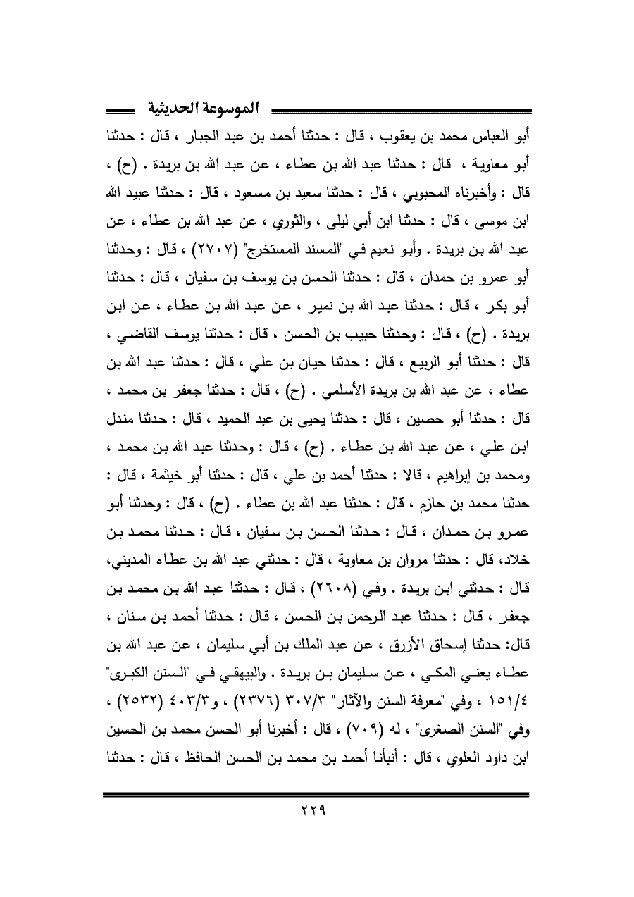 أبو العباس محمد بن يعقوب، قال: حدثنا أحمد بن عبد الجبار، قال: حدثنا أبو معاوية، قال: حدثنا عبد الله بن عطاء، عن عبد الله بن بريدة. (ح)، قال: وأخبرناه المحبوبي، قال: حدثنا سعيد بن مسعود، قال: حدثنا عبيد الله بن موسى، قال: حدثنا ابن أبي ليلى، والثوري، عن عبد الله بن عطاء، عن عبد الله بن بريدة. وأبو نعيم في "المسند المستخرج" (٢٧٠٧)، قال: وحدثنا أبو عمرو بن حمدان، قال: حدثنا الحسن بن يوسف بن سفيان، قال: حدثنا أبو بكر، قال: حدثنا عبد الله بن نمير، عن عبد الله بن عطاء، عن ابن بريدة. (ح)، قال: وحدثنا حبيب بن الحسن، قال: حدثنا يوسف القاضي، قال: حدثنا أبو الربيع، قال: حدثنا حيان بن علي، قال: حدثنا عبد الله بن عطاء، عن عبد الله بن بريدة الأسلمي. (ح)، قال: حدثنا جعفر بن محمد، قال: حدثنا أبو حصين، قال: حدثنا يحيى بن عبد الحميد، قال: حدثنا مندل بن علي، عن عبد الله بن عطاء. (ح)، قال: وحدثنا عبد الله بن محمد، ومحمد بن إبراهيم، قالا: حدثنا أحمد بن علي، قال: حدثنا أبو خيثمة، قال: حدثنا محمد بن حازم، قال: حدثنا عبد الله بن عطاء. (ح)، قال: وحدثنا أبو عمرو بن حمدان، قال: حدثنا الحسن بن سفيان، قال: حدثنا محمد بن خلاد، قال: حدثنا مروان بن معاوية، قال: حدثني عبد الله بن عطاء المديني، قال: حدثني ابن بريدة. وفي (٢٦٠٨)، قال: حدثنا عبد الله بن محمد بن جعفر، قال: حدثنا عبد الرحمن بن الحسن، قال: حدثنا أحمد بن سنان، قال: حدثنا إسحاق الأزرق، عن عبد الملك بن أبي سليمان، عن عبد الله بن عطاء يعني المكي، عن سليمان بن بريدة. والبيهقي في "السنن الكبرى" ٤/ ١٥١، وفي "معرفة السنن والآثار" ٣/ ٣٠٧ (٢٣٧٦)، و ٣/ ٤٠٣ (٢٥٣٢)، وفي "السنن الصغرى"، له (٧٠٩)، قال: أخبرنا أبو الحسن محمد بن الحسين بن داود العلوي، قال: أنبأنا أحمد بن محمد بن الحسن الحافظ، قال: حدثنا