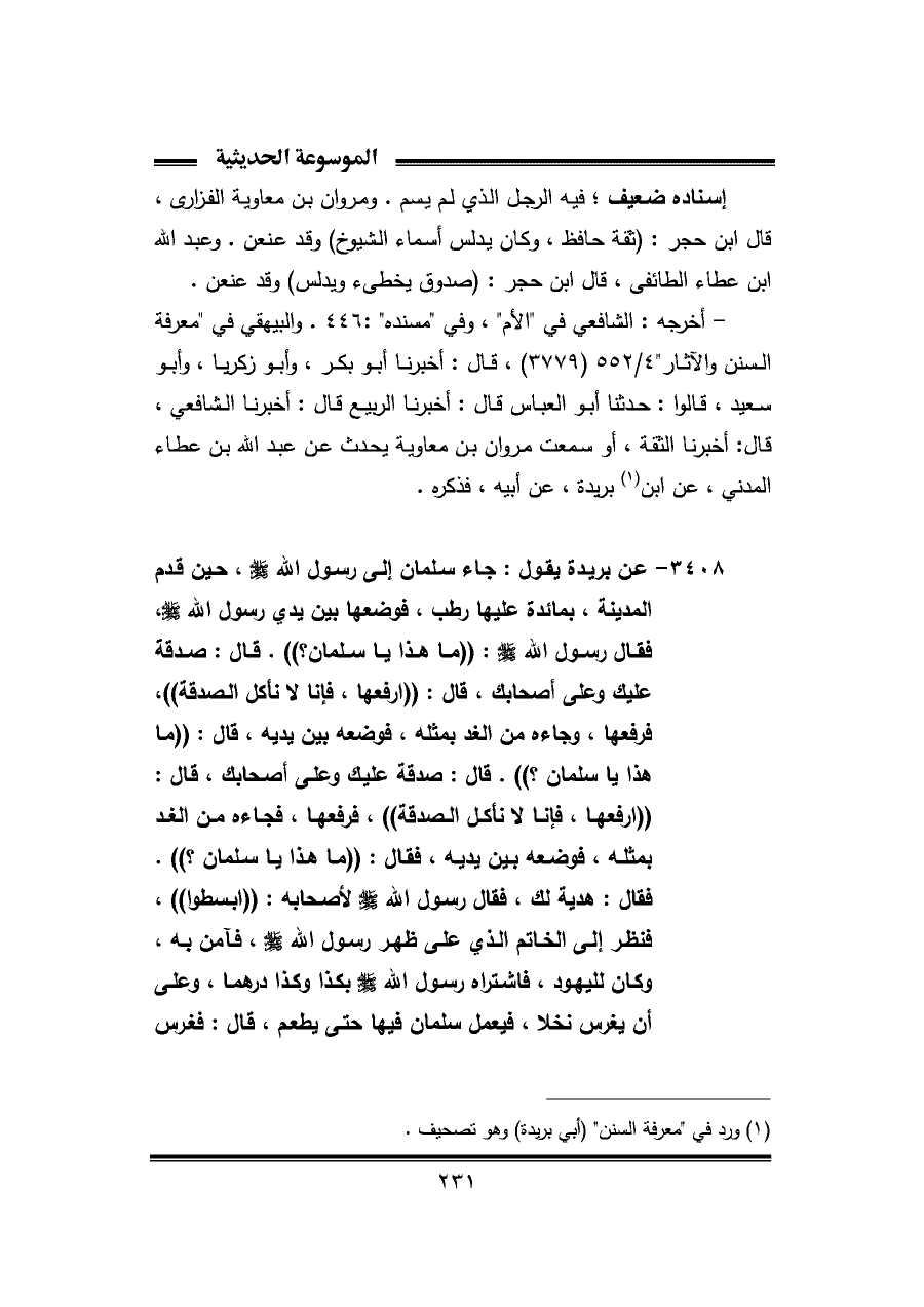 ٣٤٠٨ - عن بريدة يقول: جاء سلمان إلى رسول الله - صلى الله عليه وسلم -، حين قدم المدينة، بمائدة عليها رطب، فوضعها بين يدي رسول الله - صلى الله عليه وسلم -، فقال رسول الله - صلى الله عليه وسلم -: ((ما هذا يا سلمان؟)). قال: صدقة عليك وعلى أصحابك، قال: ((ارفعها، فإنا لا نأكل الصدقة))، فرفعها، وجاءه من الغد بمثله، فوضعه بين يديه، قال: ((ما هذا يا سلمان؟)). قال: صدقة عليك وعلى أصحابك، قال: ((ارفعها، فإنا لا نأكل الصدقة))، فرفعها، فجاءه من الغد بمثله، فوضعه بين يديه، فقال: ((ما هذا يا سلمان؟)). فقال: هدية لك، فقال رسول الله - صلى الله عليه وسلم - لأصحابه: ((ابسطوا))، فنظر إلى الخاتم الذي على ظهر رسول الله - صلى الله عليه وسلم -، فآمن به، وكان لليهود، فاشتراه رسول الله - صلى الله عليه وسلم - بكذا وكذا درهما، وعلى أن يغرس نخلا، فيعمل سلمان فيها حتى يطعم، قال: فغرس