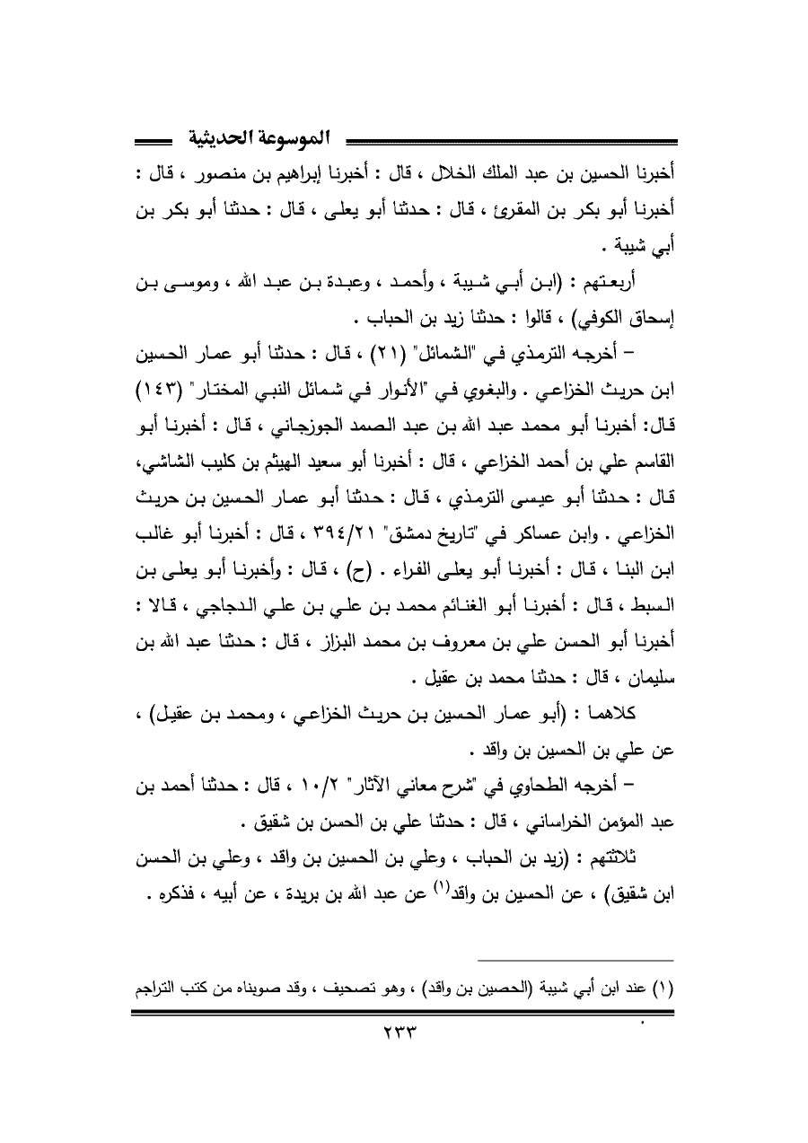 كلاهما: (أبو عمار الحسين بن حريث الخزاعي، ومحمد بن عقيل)، عن علي بن الحسين بن واقد.