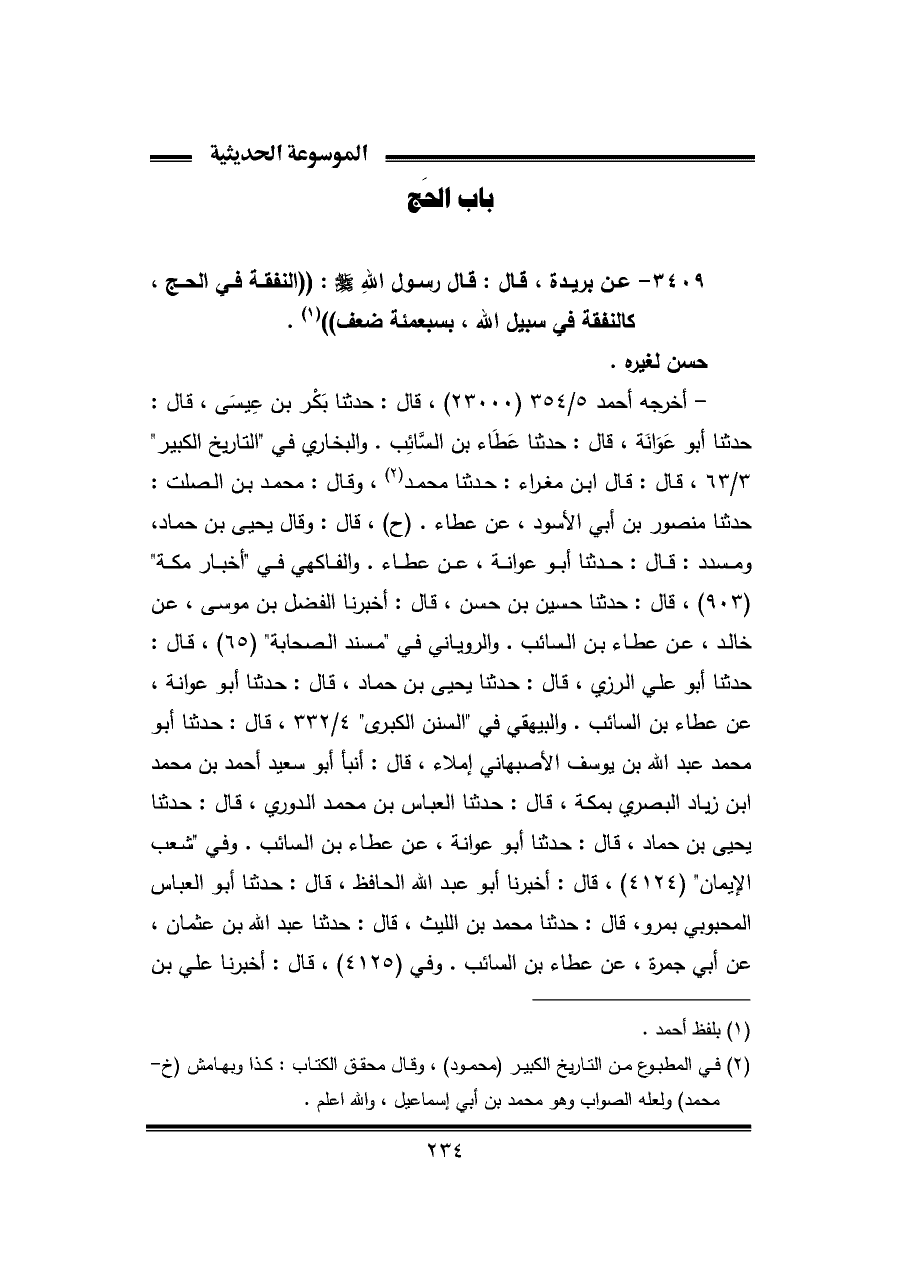 ٣٤٠٩ - عن بريدة، قال: قال رسول اللهِ - صلى الله عليه وسلم -: ((النفقة في الحج، كالنفقة في سبيل الله، بسبعمئة ضعف)) (¬١).