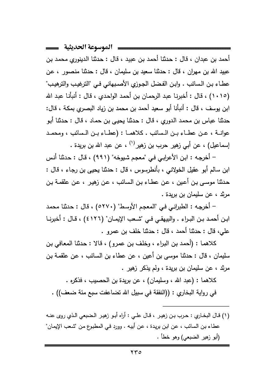أحمد بن عبدان، قال: حدثنا أحمد بن عبيد، قال: حدثنا الدينوري محمد بن عبيد الله بن مهران، قال: حدثنا سعيد بن سليمان، قال: حدثنا منصور، عن عطاء بن السائب. وابن الفضل الجوزي الأصبهاني في "الترغيب والترهيب" (١٠١٥)، قال: أخبرنا عبد الرحمان بن أحمد الواحدي، قال: أنبأنا عبد الله بن يوسف، قال: أنبأنا أبو سعيد أحمد بن محمد بن زياد البصري بمكة، قال: حدثنا عباس بن محمد الدوري، قال: حدثنا يحيى بن حماد، قال: حدثنا أبو عوانة، عن عطاء بن السائب. كلاهما: (عطاء بن السائب، ومحمد إسماعيل)، عن أبي زهير حرب بن زهير (¬١)، عن عبد الله بن بريدة.