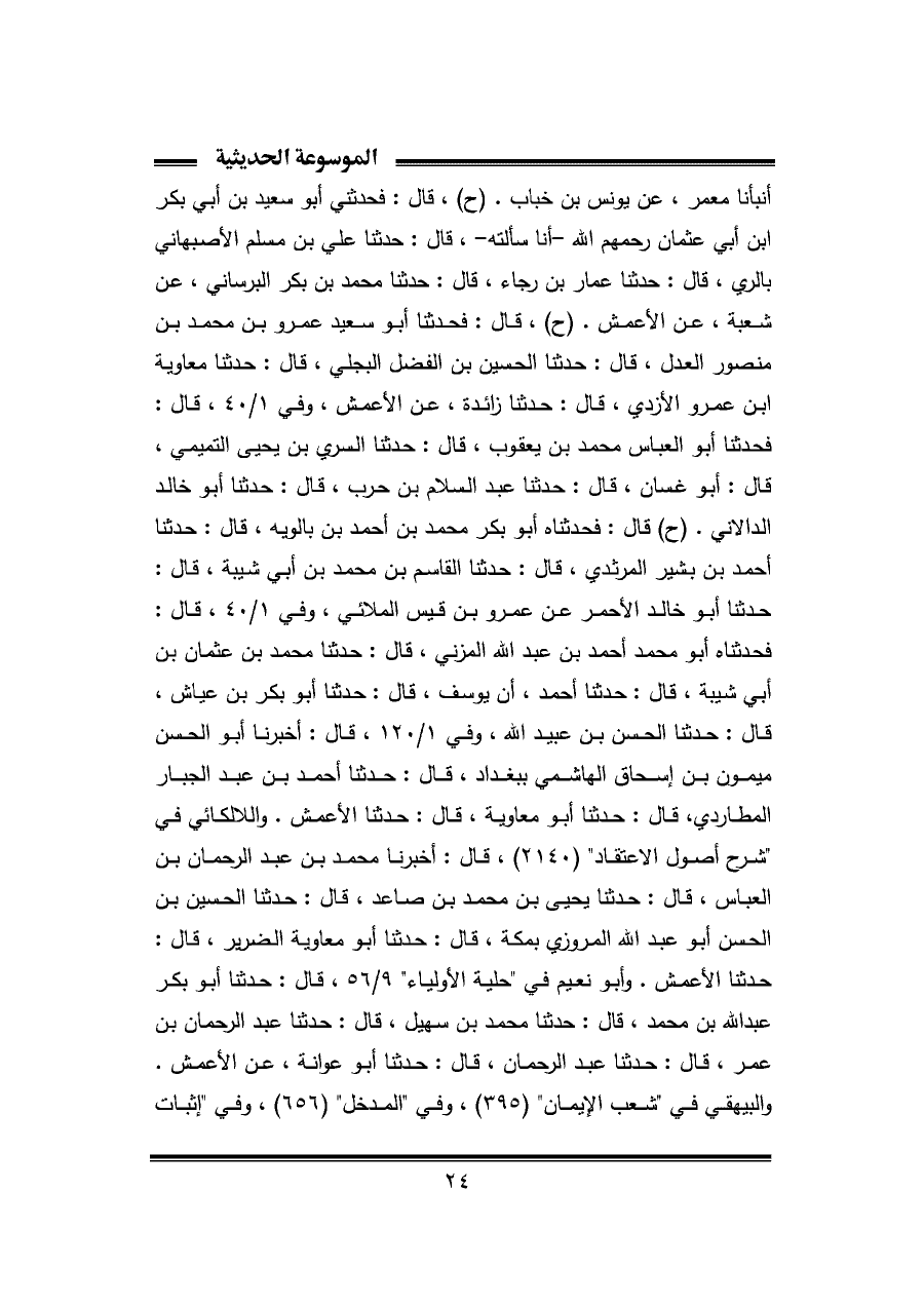 أنبأنا معمر، عن يونس بن خباب. (ح)، قال: فحدثني أبو سعيد بن أبي بكر بن أبي عثمان رحمهم الله - أنا سألته -، قال: حدثنا علي بن مسلم الأصبهاني بالري، قال: حدثنا عمار بن رجاء، قال: حدثنا محمد بن بكر البرساني، عن شعبة، عن الأعمش. (ح)، قال: فحدثنا أبو سعيد عمرو بن محمد بن منصور العدل، قال: حدثنا الحسين بن الفضل البجلي، قال: حدثنا معاوية بن عمرو الأزدي، قال: حدثنا زائدة، عن الأعمش، وفي ١/ ٤٠، قال: فحدثنا أبو العباس محمد بن يعقوب، قال: حدثنا السري بن يحيى التميمي، قال: أبو غسان، قال: حدثنا عبد السلام بن حرب، قال: حدثنا أبو خالد الدالاني. (ح) قال: فحدثناه أبو بكر محمد بن أحمد بن بالويه، قال: حدثنا أحمد بن بشير المرثدي، قال: حدثنا القاسم بن محمد بن أبي شيبة، قال: حدثنا أبو خالد الأحمر عن عمرو بن قيس الملائي، وفي ١/ ٤٠، قال: فحدثناه أبو محمد أحمد بن عبد الله المزني، قال: حدثنا محمد بن عثمان بن أبي شيبة، قال: حدثنا أحمد، أن يوسف، قال: حدثنا أبو بكر بن عياش، قال: حدثنا الحسن بن عبيد الله، وفي ١/ ١٢٠، قال: أخبرنا أبو الحسن ميمون بن إسحاق الهاشمي ببغداد، قال: حدثنا أحمد بن عبد الجبار المطاردي، قال: حدثنا أبو معاوية، قال: حدثنا الأعمش. والالكائي في "شرح أصول الاعتماد" (٢١٤٠)، قال: أخبرنا محمد بن عبد الرحمان بن العباس، قال: حدثنا يحيى بن محمد بن صاعد، قال: حدثنا الحسين بن الحسن أبو عبد الله المروزي بمكة، قال: حدثنا أبو معاوية الضرير، قال: حدثنا الأعمش. وأبو نعيم في "حلية الأولياء" ٩/ ٥٦، قال: حدثنا أبو بكر عبد الله بن محمد، قال: حدثنا محمد بن سهيل، قال: حدثنا عبد الرحمان بن عمر، قال: حدثنا عبد الرحمان، قال: حدثنا أبو عوانة، عن الأعمش. والبيهقي في "شعب الإيمان" (٣٩٥)، وفي "المدخل" (٦٥٦)، وفي "إثبات