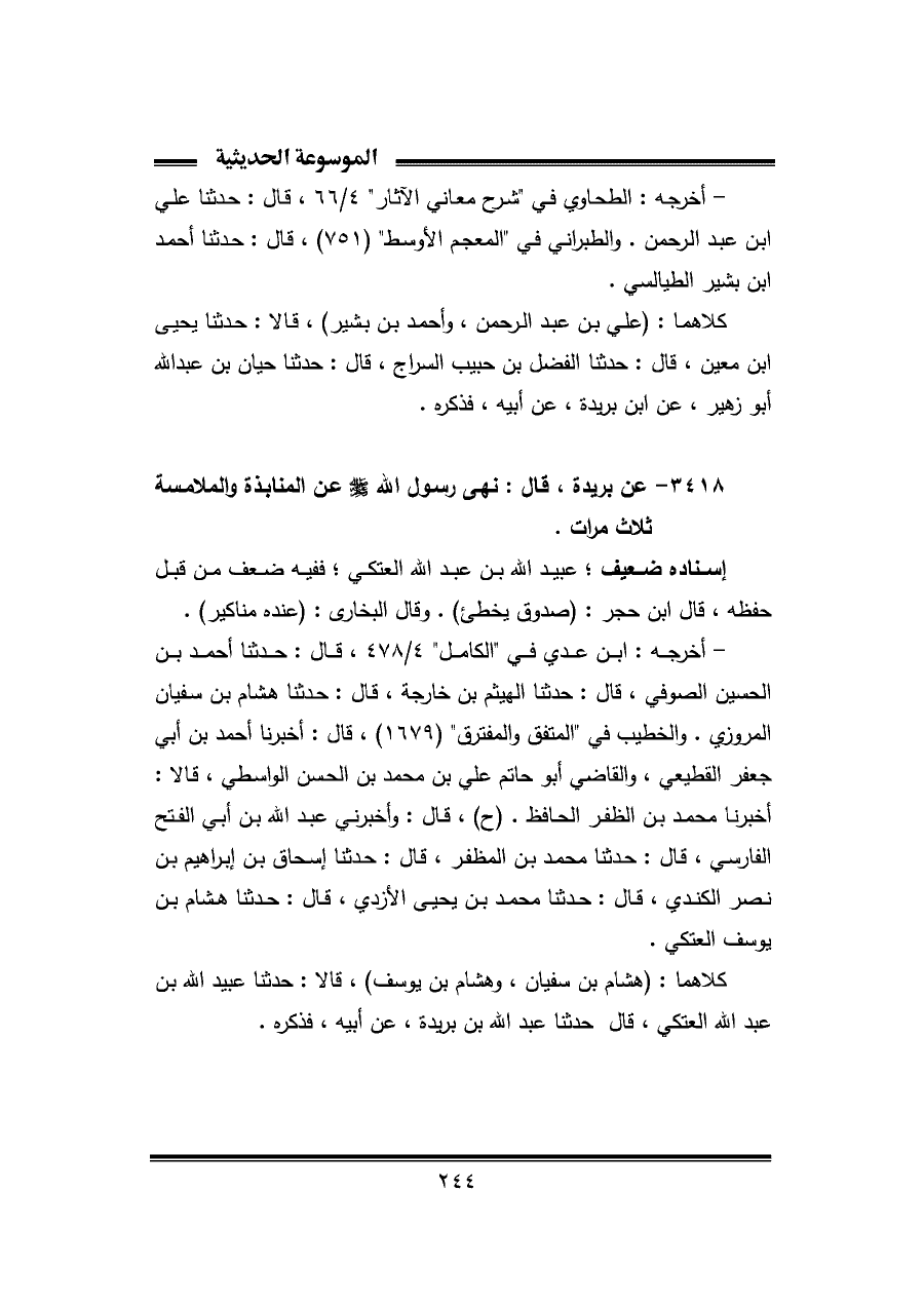 ٣٤١٨ - عن بريدة، قال: نهى رسول الله - صلى الله عليه وسلم - عن المنابذة والملامسة ثلاث مرات.