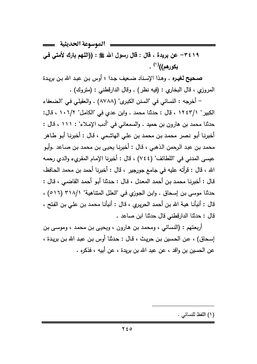 أربعتهم: (النسائي، ومحمد بن هارون، ويحيى بن محمد، وموسى بن إسحاق)، عن الحسين بن حريث، قال: حدثنا أوس بن عبد الله بن بريدة, عن الحسين بن واقد، عن عبد الله بن بريدة, عن أبيه، فذكره.