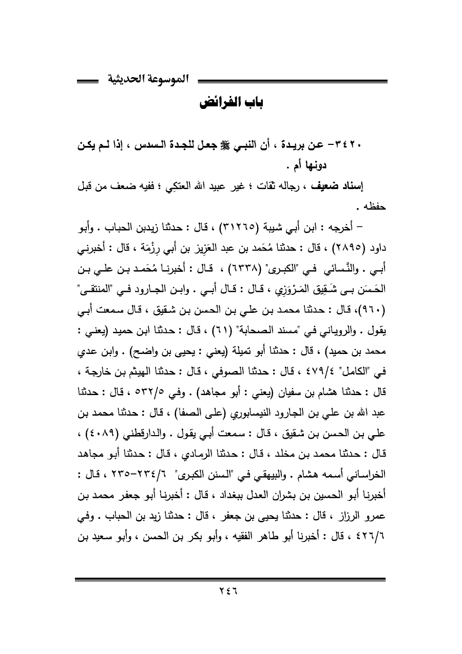 ٣٤٢٠ - عن بريدة، أن النبي - صلى الله عليه وسلم - جعل للجدة السدس، إذا لم يكن دونها أم.