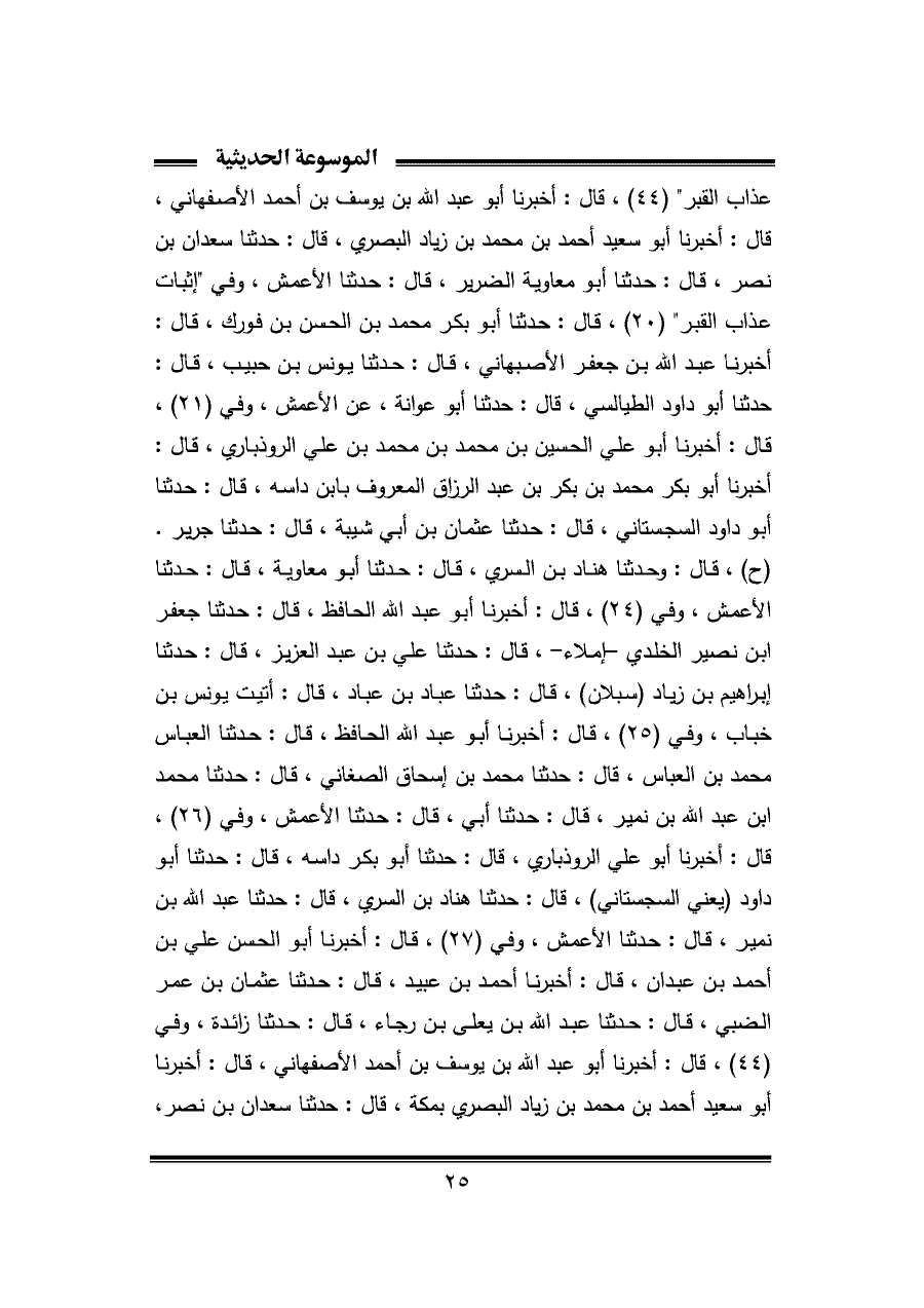 عذاب القبر" (٤٤)، قال: أخبرنا أبو عبد الله بن يوسف بن أحمد الأصفهاني، قال: أخبرنا أبو سعيد أحمد بن محمد بن زياد البصري، قال: حدثنا سعدان بن نصر، قال: حدثنا أبو معاوية الضرير، قال: حدثنا الأعمش، وفي "إثبات عذاب القبر" (٢٠)، قال: حدثنا أبو بكر محمد بن الحسن بن فورك، قال: أخبرنا عبد الله بن جعفر الأصبهاني، قال: حدثنا يونس بن حبيب، قال: حدثنا أبو داود الطيالسي، قال: حدثنا أبو عوانة، عن الأعمش، وفي (٢١)، قال: أخبرنا أبو علي الحسين بن محمد بن محمد بن علي الروذباري، قال: أخبرنا أبو بكر محمد بن بكر بن عبد الرزاق المعروف بابن داسه، قال: حدثنا أبو داود السجستاني، قال: حدثنا عثمان بن أبي شيبة، قال: حدثنا جرير. (ح)، قال: وحدثنا هناد بن السري، قال: حدثنا أبو معاوية، قال: حدثنا الأعمش، وفي (٢٤)، قال: أخبرنا أبو عبد الله الحافظ، قال: حدثنا جعفر بن نصير الخلدي - إملاء -، قال: حدثنا علي بن عبد العزيز، قال: حدثنا إبراهيم بن زياد (سبلان)، قال: حدثنا عباد بن عباد، قال: أتيت يونس بن خباب، وفي (٢٥)، قال: أخبرنا أبو عبد الله الحافظ، قال: حدثنا العباس محمد بن العباس، قال: حدثنا محمد بن إسحاق الصغاني، قال: حدثنا محمد بن عبد الله بن نمير، قال: حدثنا أبي، قال: حدثنا الأعمش، وفي (٢٦)، قال: أخبرنا أبو علي الروذباري، قال: حدثنا أبو بكر داسه، قال: حدثنا أبو داود (يعني السجستاني)، قال: حدثنا هناد بن السري، قال: حدثنا عبد الله بن نمير، قال: حدثنا الأعمش، وفي (٢٧)، قال: أخبرنا أبو الحسن علي بن أحمد بن عبدان، قال: أخبرنا أحمد بن عبيد، قال: حدثنا عثمان بن عمر الضبي، قال: حدثنا عبد الله بن يعلى بن رجاء، قال: حدثنا زائدة، وفي (٤٤)، قال: أخبرنا أبو عبد الله بن يوسف بن أحمد الأصفهاني، قال: أخبرنا أبو سعيد أحمد بن محمد بن زياد البصري بمكة، قال: حدثنا سعدان بن نصر،