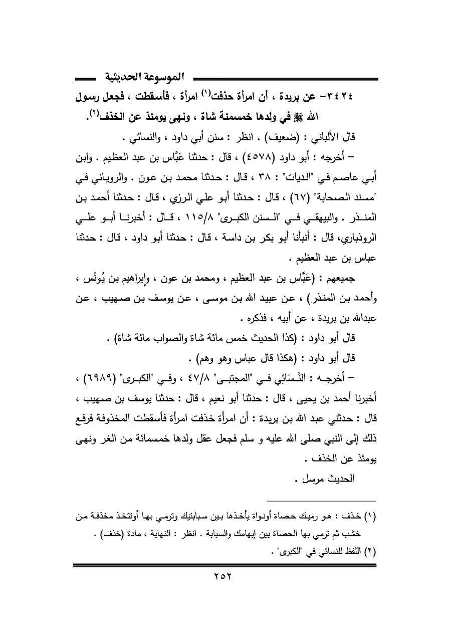 ٣٤٢٤ - عن بريدة، أن امرأة حدفت (¬١) امرأة، فأسقطت، فجعل رسول الله - صلى الله عليه وسلم - في ولدها خمسمئة شاة، ونهى يومئذ عن الخذف (¬٢).