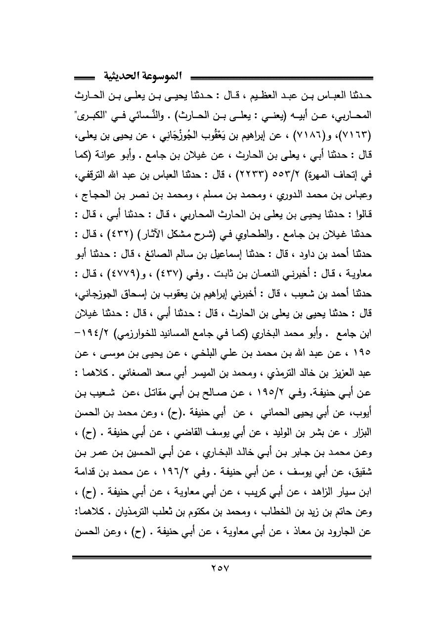 حدثنا العباس بن عبد العظيم، قال: حدثنا يحيى بن يعلى بن الحارث المحاربي، عن أبيه (يعني: يعلى بن الحارث). والنَّسائي في "الكبرى" (٧١٦٣)، و (٧١٨٦)، عن إبراهيم بن يَعْقُوب الجُوزْجَانِي، عن يحيى بن يعلى، قال: حدثنا أبي، يعلى بن الحارث، عن غيلان بن جامع. وأبو عوانة (كما في إتحاف المهرة) ٢/ ٥٥٣ (٢٢٣٣)، قال: حدثنا العباس بن عبد الله الترقفي، وعباس بن محمد الدوري، ومحمد بن مسلم، ومحمد بن نصر بن الحجاج، قالوا: حدثنا يحيى بن يعلى بن الحارث المحاربي، قال: حدثنا أبي، قال: حدثنا غيلان بن جامع. والطحاوي في (شرح مشكل الآثار) (٤٣٢)، قال: حدثنا أحمد بن داود، قال: حدثنا إسماعيل بن سالم الصائغ، قال: حدثنا أبو معاوية، قال: أخبرني النعمان بن ثابت. وفي (٤٣٧)، و (٤٧٧٩)، قال: حدثنا أحمد بن شعيب، قال: أخبرني إبراهيم بن يعقوب بن إسحاق الجوزجاني، قال: حدثنا يحيى بن يعلى بن الحارث، قال: حدثنا أبي، قال: حدثنا غيلان بن جامع. وأبو محمد البخاري (كما في جامع المسانيد للخوارزمي) ٢/ ١٩٤ - ١٩٥، عن عبد الله بن محمد بن علي البلخي، عن يحيى بن موسى، عن عبد العزيز بن خالد الترمذي، ومحمد بن الميسر أبي سعد الصغاني. كلاهما: عن أبي حنيفة. وفي ٢/ ١٩٥، عن صالح بن أبي مقاتل، عن شعيب بن أيوب، عن أبي يحيى الحماني، عن أبي حنيفة. (ح)، وعن محمد بن الحسن البزار، عن بشر بن الوليد، عن أبي يوسف القاضي، عن أبي حنيفة. (ح)، وعن محمد بن جابر بن أبي خالد البخاري، عن أبي الحسين بن عمر بن شقيق، عن أبي يوسف، عن أبي حنيفة. وفي ٢/ ١٩٦، عن محمد بن قدامة بن سيار الزاهد، عن أبي غريب، عن أبي معاوية، عن أبي حنيفة. (ح)، وعن حاتم بن زيد بن الخطاب، ومحمد بن مكتوم بن ثعلب الترمذيان. كلاهما: عن الجارود بن معاذ، عن أبي معاوية، عن أبي حنيفة. (ح)، وعن الحسن