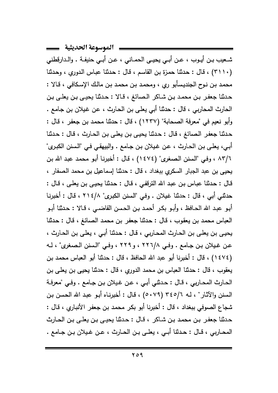 شعيب بن أيوب، عن أبي يحيى الحماني، عن أبي حنيفة. والدارقطني (٣١١٠)، قال: حدثنا حمزة بن القاسم، قال: حدثنا عباس الدوري، وحدثنا محمد بن نوح الجنديسأبوري، ومحمد بن محمد بن مالك الإسكافي، قالا: حدثنا جعفر بن محمد بن شاكر الصائغ، قالا: حدثنا يحيى بن يعلى بن الحارث المحاربي، قال: حدثنا أبي يعلى بن الحارث، عن غيلان بن جامع. وأبو نعيم في "معرفة الصحابة" (١٢٣٧)، قال: حدثنا محمد بن جعفر، قال: حدثنا جعفر الصائغ، قال: حدثنا يحيى بن يعلى بن الحارث، قال: حدثنا أبي، يعلى بن الحارث، عن غيلان بن جامع. والبيهقي في "السنن الكبرى" ٦/ ٨٣، وفي "السنن الصغرى" (١٤٧٤)، قال: أخبرنا أبو محمد عبد الله بن يحيى بن عبد الجبار السكري ببغداد، قال: حدثنا إسماعيل بن محمد الصفار، قال: حدثنا عباس بن عبد الله الترقفي، قال: حدثنا يحيى بن يعلى، قال: حدثني أبي، قال: حدثنا غيلان. وفي "السنن الكبرى" ٨/ ٢١٤، قال: أخبرنا أبو عبد الله الحافظ، وأبو بكر أحمد بن الحسن القاضي، قالا: حدثنا أبو العباس محمد بن يعقوب، قال: حدثنا جعفر بن محمد الصائغ، قال: حدثنا يحيى بن يعلى بن الحارث المحاربي، قال: حدثنا أبي، يعلى بن الحارث، عن غيلان بن جامع. وفي ٨/ ٢٢٦، و ٢٢٩، وفي "السنن الصغرى"، له (١٤٧٤)، قال: أخبرنا أبو عبد الله الحافظ، قال: حدثنا أبو العباس محمد بن يعقوب، قال: حدثنا العباس بن محمد الدوري، قال: حدثنا يحيى بن يعلى بن الحارث المحاربي، قال: حدثني أبي، عن غيلان بن جامع. وفي "معرفة السنن والآثار"، له ٦/ ٣٤٥ (٥٠٧٩)، قال: أخبرناه أبو عبد الله الحسن بن شجاع الصوفي ببغداد، قال: أخبرنا أبو بكر محمد بن جعفر الأنباري، قال: حدثنا جعفر بن محمد بن شاكر، قال: حدثنا يحيى بن يعلى بن الحارث المحاربي، قال: حدثنا أبي، يعلى بن الحارث، عن غيلان بن جامع.