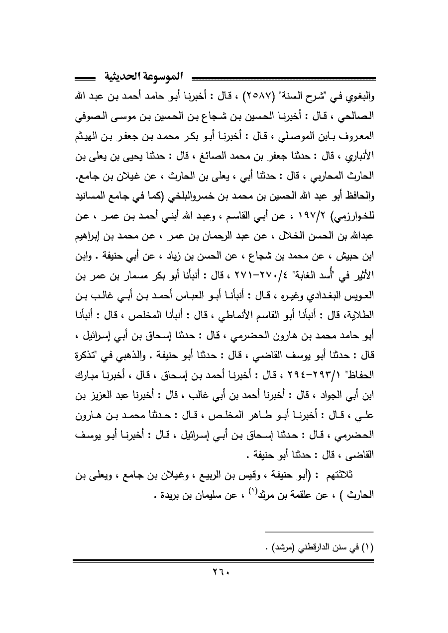 والبغوي في "شرح السنة" (٢٥٨٧)، قال: أخبرنا أبو حامد أحمد بن عبد الله الصالحي، قال: أخبرنا الحسين بن شجاع بن الحسين بن موسى الصوفي المعروف بابن الموصلي، قال: أخبرنا أبو بكر محمد بن جعفر بن الهيثم الأنباري، قال: حدثنا جعفر بن محمد الصائغ، قال: حدثنا يحيى بن يعلى بن الحارث المحاربي، قال: حدثنا أبي، يعلى بن الحارث، عن غيلان بن جامع. والحافظ أبو عبد الله الحسين بن محمد بن خسروالبلخي (كما في جامع المسانيد للخوارزمي) ٢/ ١٩٧، عن أبي القاسم، وعبد الله أبني أحمد بن عمر، عن عبد الله بن الحسن الخلال، عن عبد الرحمان بن عمر، عن محمد بن إبراهيم بن حبيش، عن محمد بن شجاع، عن الحسن بن زياد، عن أبي حنيفة. وابن الأثير في "أُسد الغابة" ٤/ ٢٧٠ - ٢٧١، قال: أنبأنا أبو بكر مسمار بن عمر بن العويس البغدادي وغيره، قال: أنبأنا أبو العباس أحمد بن أبي غالب بن الطلاية، قال: أنبأنا أبو القاسم الأنماطي، قال: أنبأنا المخلص، قال: أنبأنا أبو حامد محمد بن هارون الحضرمي، قال: حدثنا إسحاق بن أبي إسرائيل، قال: حدثنا أبو يوسف القاضي، قال: حدثنا أبو حنيفة. والذهبي في "تذكرة الحفاظ" ١/ ٢٩٣ - ٢٩٤، قال: أخبرنا أحمد بن إسحاق، قال، أخبرنا مبارك بن أبي الجواد، قال: أخبرنا أحمد بن أبي غالب، قال: أخبرنا عبد العزيز بن علي، قال: أخبرنا أبو طاهر المخلص، قال: حدثنا محمد بن هارون الحضرمي، قال: حدثنا إسحاق بن أبي إسرائيل، قال: أخبرنا أبو يوسف القاضى، قال: حدثنا أبو حنيفة.