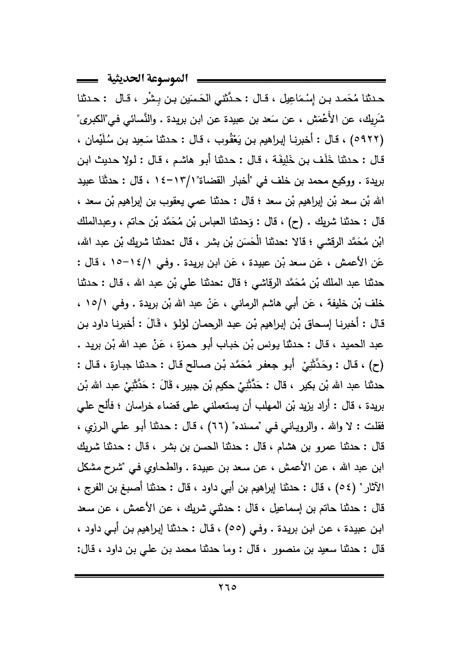 حدثنا مُحَمد بن إِسْمَاعِيل، قال: حدَّثني الحَسَين بن بِشْر، قال: حدثنا شَرِيك، عن الأَعْمَش، عن سَعد بن عبيدة عن ابن بريدة. والنَّسائي في "الكبرى" (٥٩٢٢)، قال: أخبرنا إبراهيم بن يَعْقُوب، قال: حدثنا سَعِيد بن سُلَيْمان، قال: حدثنا خَلَف بن خَلِيفَة، قال: حدثنا أبو هاشم، قال: لولا حديث ابن بريدة. ووكيع محمد بن خلف في "أخبار القضاة" ١/ ١٣ - ١٤، قال: حدثنَا عبيد الله بْن سعد بْن إبراهيم بْن سعد؛ قال: حدثنا عمي يعقوب بن إبراهيم بْن سعد، قال: حدثنا شريك. (ح)، قال: وَحدثنا العباس بْن مُحَمَّد بْن حاتم، وعبد الملك بْن مُحَمَّد الرقشي؛ قالا: حدثنا الْحَسَن بْن بشر، قال: حدثنا شريك بْن عبد الله، عَن الأعمش، عَن سعد بْن عبيدة، عَن ابن بريدة. وفي ١٤/ ١ - ١٥، قال: حدثنا عبد الملك بْن مُحَمَّد الرقاشي؛ قال: حدثنا علي بْن عبد الله، قال: حدثنا خلف بْن خليفة، عَن أبي هاشم الرماني، عَنْ عبد الله بْن بريدة. وفي ١/ ١٥، قال: أخبرنا إسحاق بْن إبراهيم بْن عبد الرحمان لؤلؤ، قَالَ: أخبرنا داود بن عبد الحميد، قال: حدثنا يونس بْن خباب أبو حمزة، عَنْ عبد الله بْن بريد. (ح)، قال: وحَدَّثَنيْ أبو جعفر مُحَمَّد بْن صالح قال: حدثنا جبارة، قال: حدثنا عبد الله بْن بكير، قال: حَدَّثَنِي حكيم بْن جبير، قَالَ: حَدَّثَنِيْ عبد الله بْن بريدة، قال: أراد يزيد بْن المهلب أن يستعملني على قضاء خراسان؛ فألح علي فقلت: لا والله. والروياني في "مسنده" (٦٦)، قال: حدثنا أبو علي الرزي، قال: حدثنا عمرو بن هشام، قال: حدثنا الحسن بن بشر، قال: حدثنا شريك بن عبد الله، عن الأعمش، عن سعد بن عبيدة. والطحاوي في "شرح مشكل الآثار" (٥٤)، قال: حدثنا إبراهيم بن أبي داود، قال: حدثنا أصبغ بن الفرج، قال: حدثنا حاتم بن إسماعيل، قال: حدثني شريك، عن الأعمش، عن سعد بن عبيدة، عن ابن بريدة. وفي (٥٥)، قال: حدثنا إبراهيم بن أبي داود، قال: حدثنا سعيد بن منصور، قال: وما حدثنا محمد بن علي بن داود، قال:
