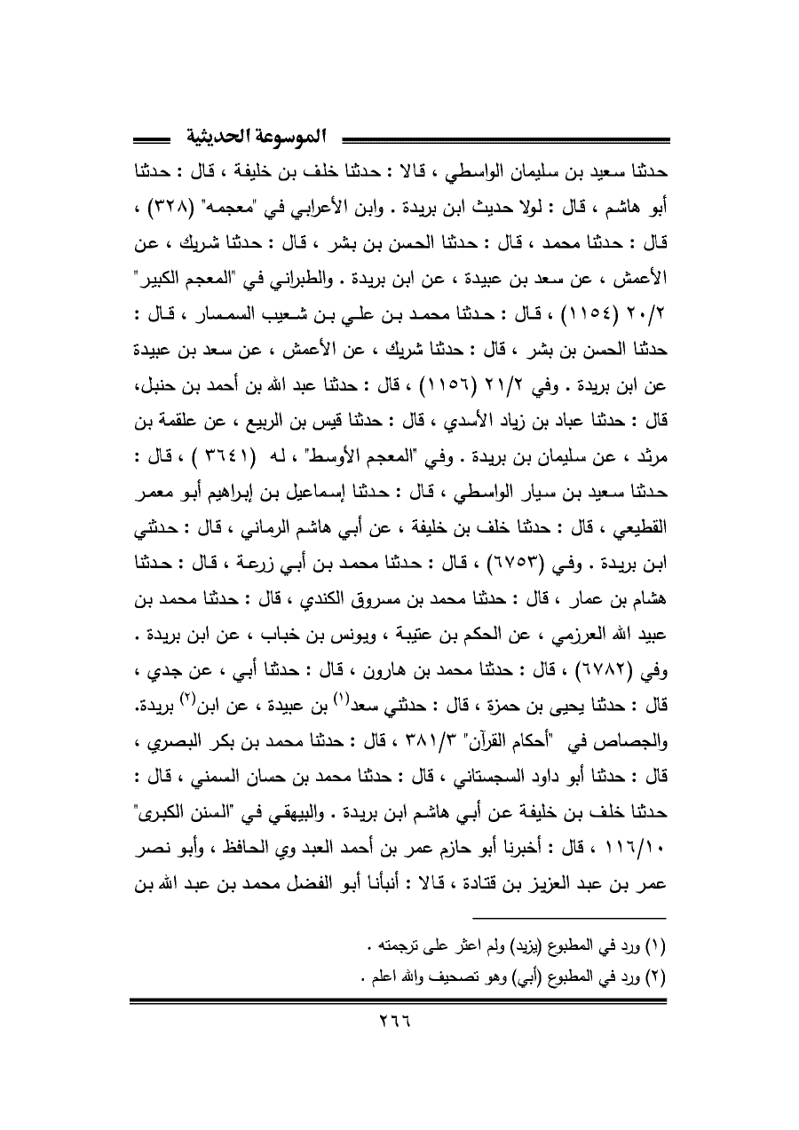 حدثنا سعيد بن سليمان الواسطي، قالا: حدثنا خلف بن خليفة، قال: حدثنا أبو هاشم، قال: لولا حديث ابن بريدة. وابن الأعرابي في "معجمه" (٣٢٨)، قال: حدثنا محمد، قال: حدثنا الحسن بن بشر، قال: حدثنا شريك، عن الأعمش، عن سعد بن عبيدة، عن ابن بريدة. والطبراني في "المعجم الكبير" ٢/ ٢٠ (١١٥٤)، قال: حدثنا محمد بن علي بن شعيب السمسار، قال: حدثنا الحسن بن بشر، قال: حدثنا شريك، عن الأعمش، عن سعد بن عبيدة عن ابن بريدة. وفي ٢/ ٢١ (١١٥٦)، قال: حدثنا عبد الله بن أحمد بن حنبل، قال: حدثنا عباد بن زياد الأسدي، قال: حدثنا قيس بن الربيع، عن علقمة بن مرثد، عن سليمان بن بريدة. وفي "المعجم الأوسط"، له (٣٦٤١)، قال: حدثنا سعيد بن سيار الواسطي، قال: حدثنا إسماعيل بن إبراهيم أبو معمر القطيعي، قال: حدثنا خلف بن خليفة، عن أبي هاشم الرماني، قال: حدثني بن بريدة. وفي (٦٧٥٣)، قال: حدثنا محمد بن أبي زرعة، قال: حدثنا هشام بن عمار، قال: حدثنا محمد بن مسروق الكندي، قال: حدثنا محمد بن عبيد الله العرزمي، عن الحكم بن عتيبة، ويونس بن خباب، عن ابن بريدة. وفي (٦٧٨٢)، قال: حدثنا محمد بن هارون، قال: حدثنا أبي، عن جدي، قال: حدثنا يحيى بن حمزة، قال: حدثني سعد (¬١) بن عبيدة، عن ابن (¬٢) بريدة. والجصاص في "أحكام القرآن" ٣/ ٣٨١، قال: حدثنا محمد بن بكر البصري، قال: حدثنا أبو داود السجستاني، قال: حدثنا محمد بن حسان السمني، قال: حدثنا خلف بن خليفة عن أبي هاشم بن بريدة. والبيهقي في "السنن الكبرى" ١١٦/ ١٠، قال: أخبرنا أبو حازم عمر بن أحمد العبد وي الحافظ، وأبو نصر عمر بن عبد العزيز بن قتادة، قالا: أنبأنا أبو الفضل محمد بن عبد الله بن