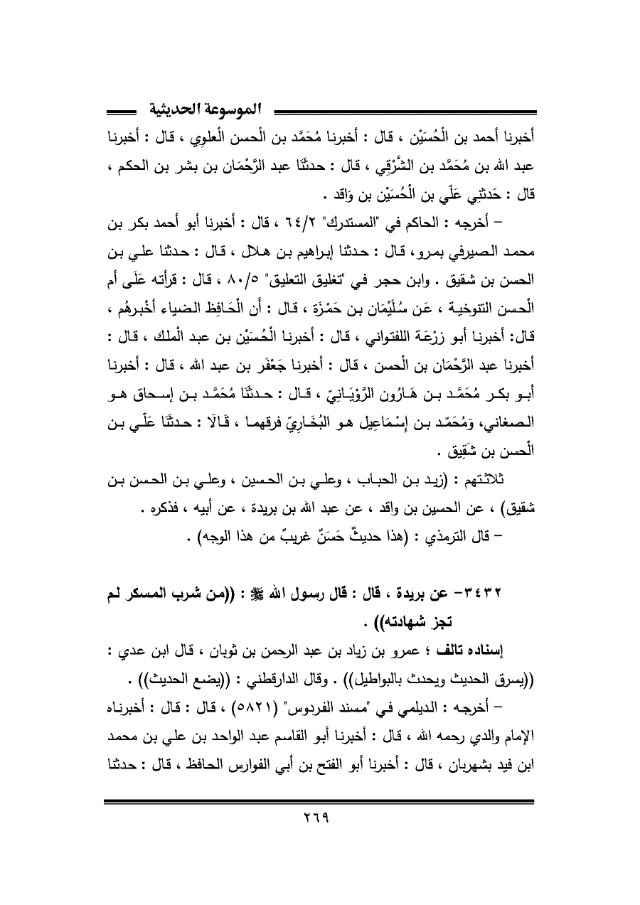 أخبرنا أحمد بن الْحُسَيْن، قال: أخبرنا مُحَمَّد بن الْحسن الْعلوِي، قال: أخبرنا عبد الله بن مُحَمَّد بن الشَّرْقِي، قال: حدثَنَا عبد الرَّحْمَان بن بشر بن الحكم، قال: حَدثَنِي عَلّي بن الْحُسَيْن بن وَاقد.
