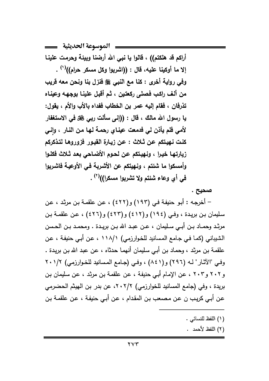 - أخرجه: أبو حنيفة في (١٩٣) و (٤٢٢)، عن علقمة بن مرثد، عن سليمان بن بريدة، وفي (١٩٤) و (٤١٢) و (٤٢٣) و (٤٢٦)، عن علقمة بن مرثد وحماد بن أبي سليمان، عن عبد الله بن بريدة. ومحمد بن الحسن الشيباني (كما في جامع المسانيد للخوارزمي) ١/ ١١٨، عن أبي حنيفة، عن علقمة بن مرثد، وحماد بن أبي سليمان أنهما حدثاه، عن عبد الله بن بريدة. وفي "الآثار" له (٢٩٦) و (٨٤١)، وفي (جامع المسانيد للخوارزمي) ٢/ ٢٠١ و ٢٠٢ و ٢٠٣، عن الإمام أبي حنيفة، عن علقمة بن مرثد، عن سليمان بن بريدة، وفي (جامع المسانيد للخوارزمي) ٢/ ٢٠٢، عن بدر بن الهيثم الحضرمي عن أبي كريب، عن مصعب بن المقدام، عن أبي حنيفة، عن علقمة بن